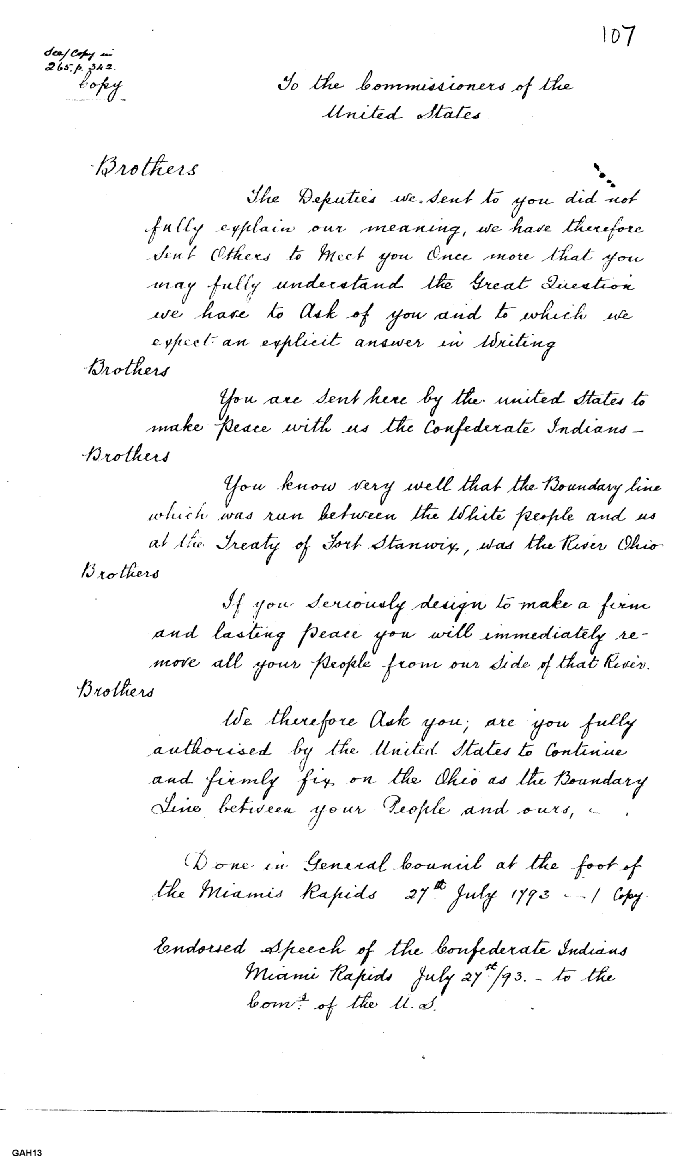 - Document: Speech from the Confederate Indians at Miami Rapids