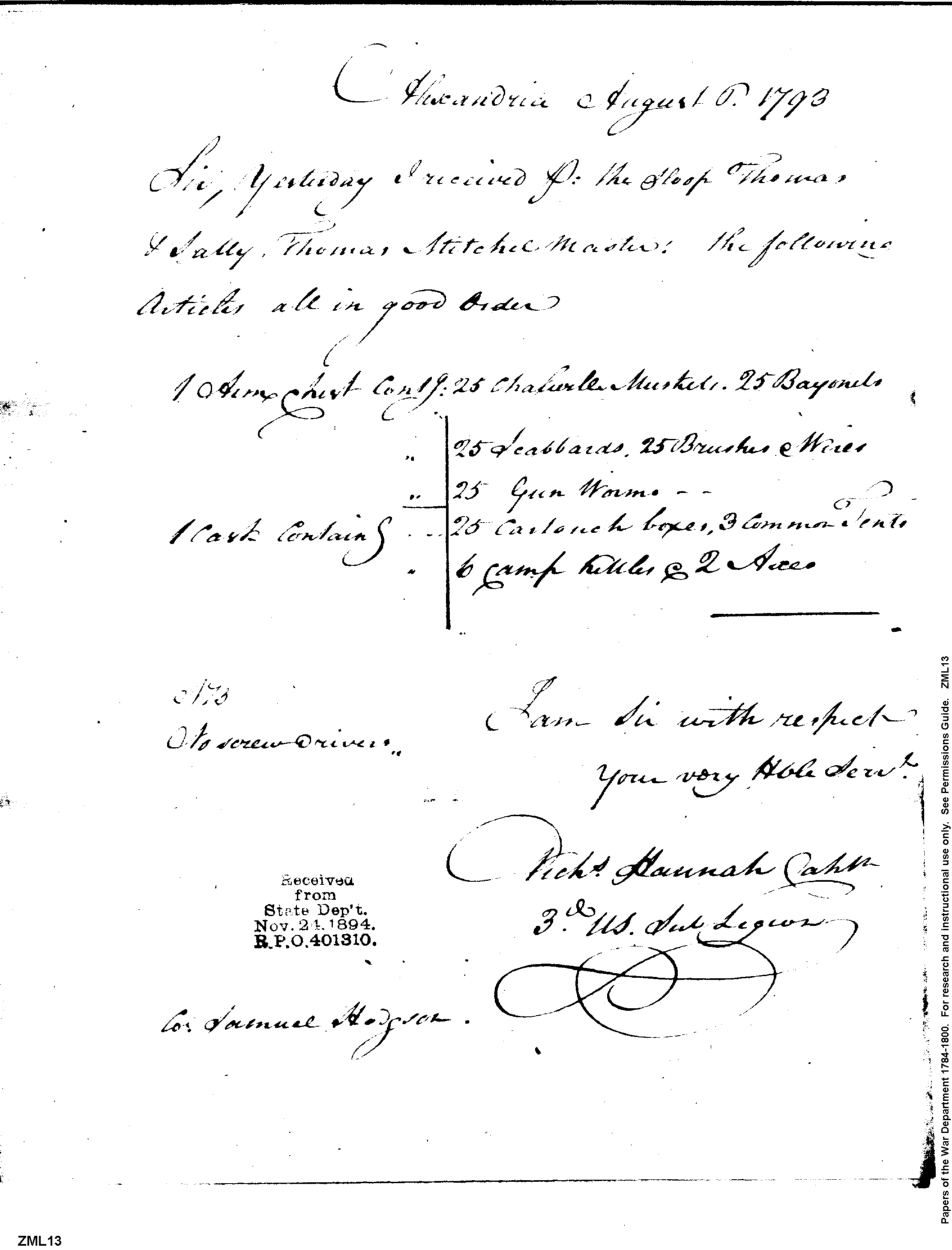Post Revolutionary War Papers, 1784-1815. (RG94)