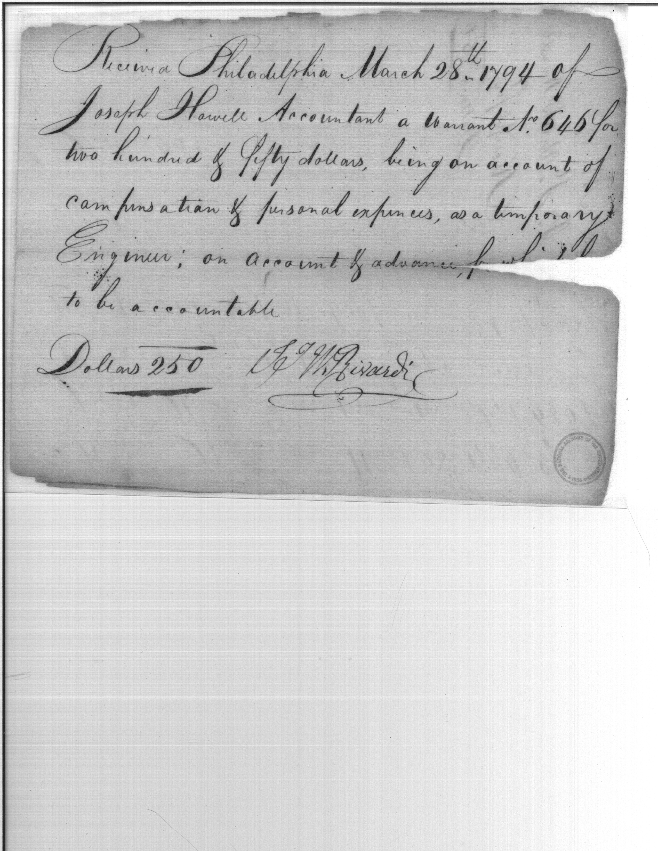 - Document: Payment to John Jacob Rivardi for expenses as temporary engineer