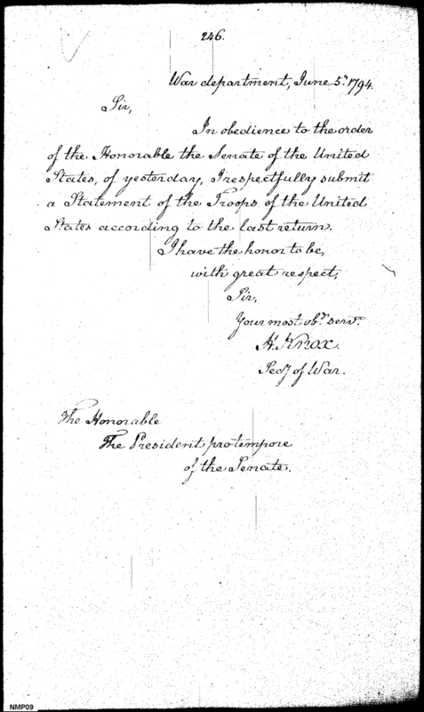 - In source: Collection: Transcribed Reports and Communications Transmitted by the Executive Branch to the Senate, 1789-1819. (RG46) (M1257, rolls 1-3)