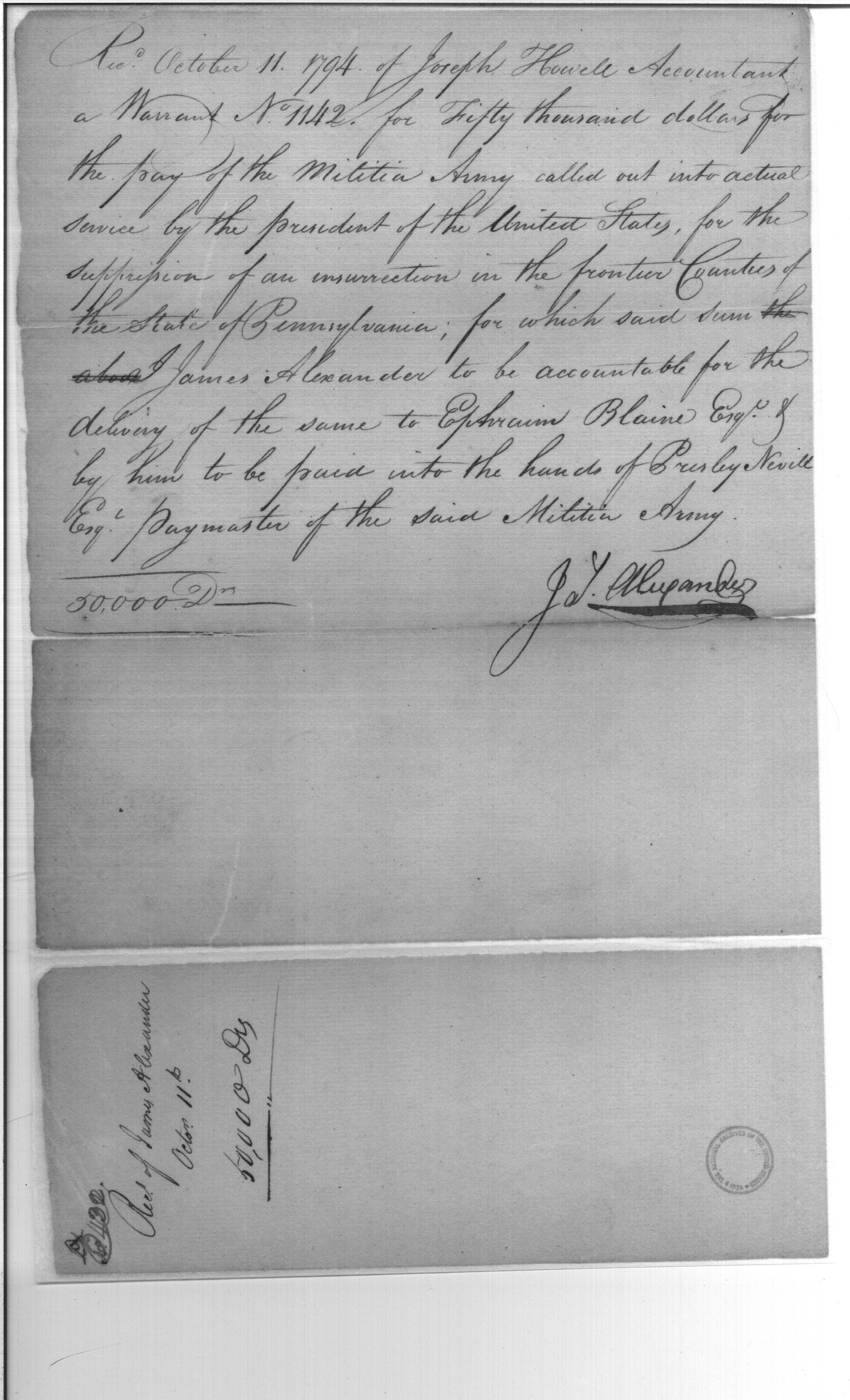- Document: Receipt for payment of militia army called into service by President of United States for suppression of insurrection in frontier counties of Pennsylvania