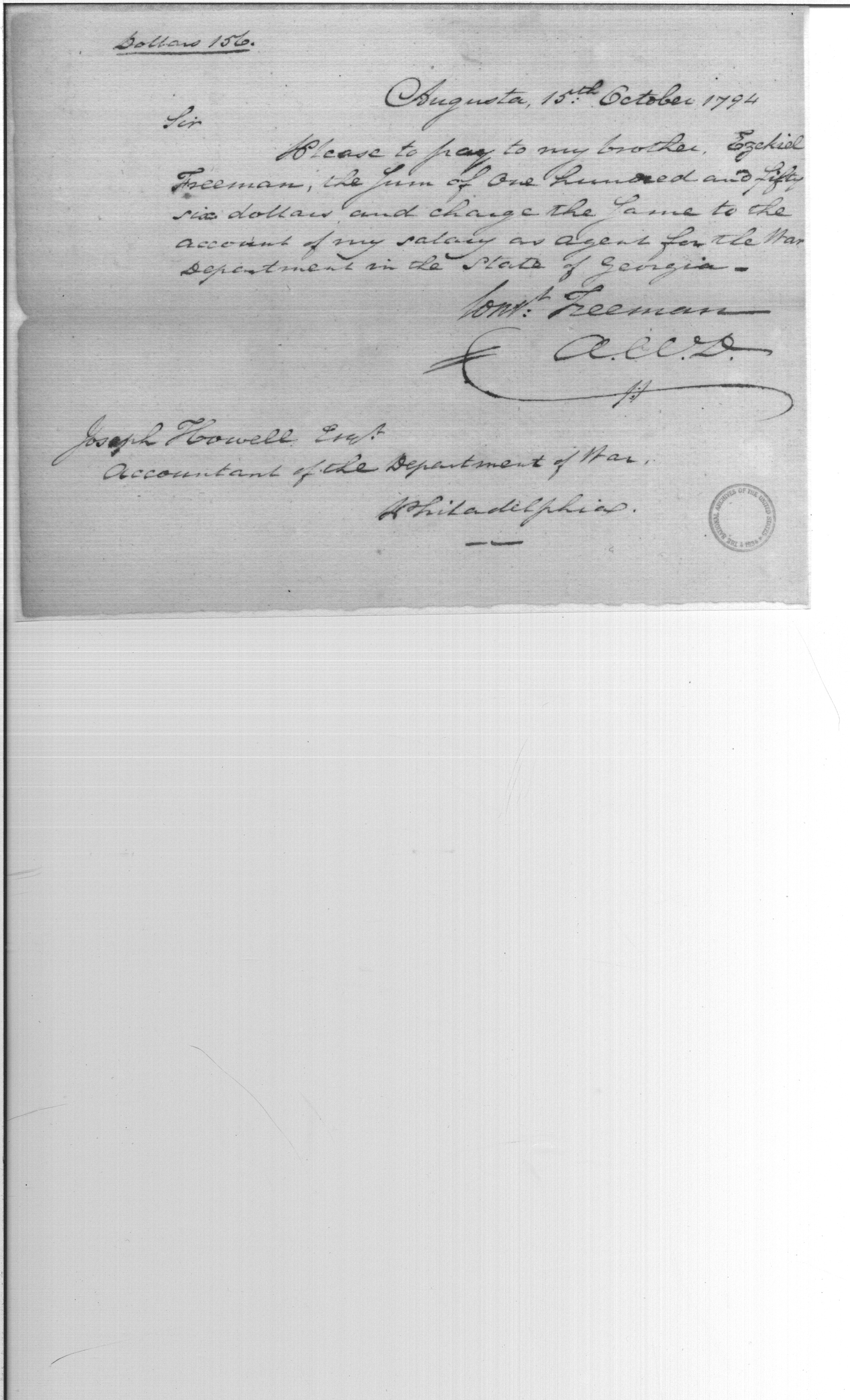 - Document: Payment to Ezekiel Freeman on account of Constant Freeman salary as agent for war department state of Georgia