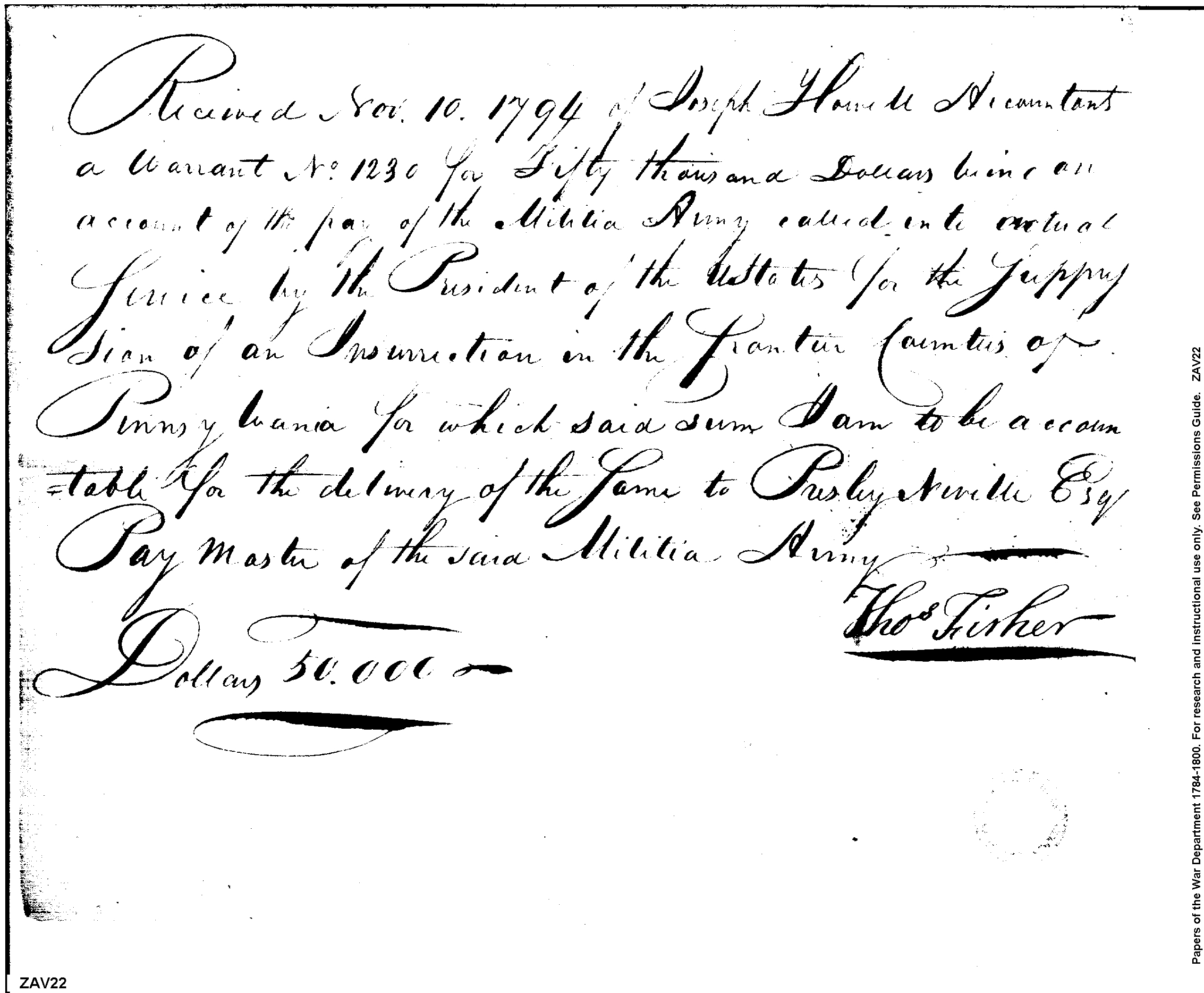 - Document: Receipt for payment of militia army called into service by President of United States for suppression of insurrection in frontier counties of Pennsylvania