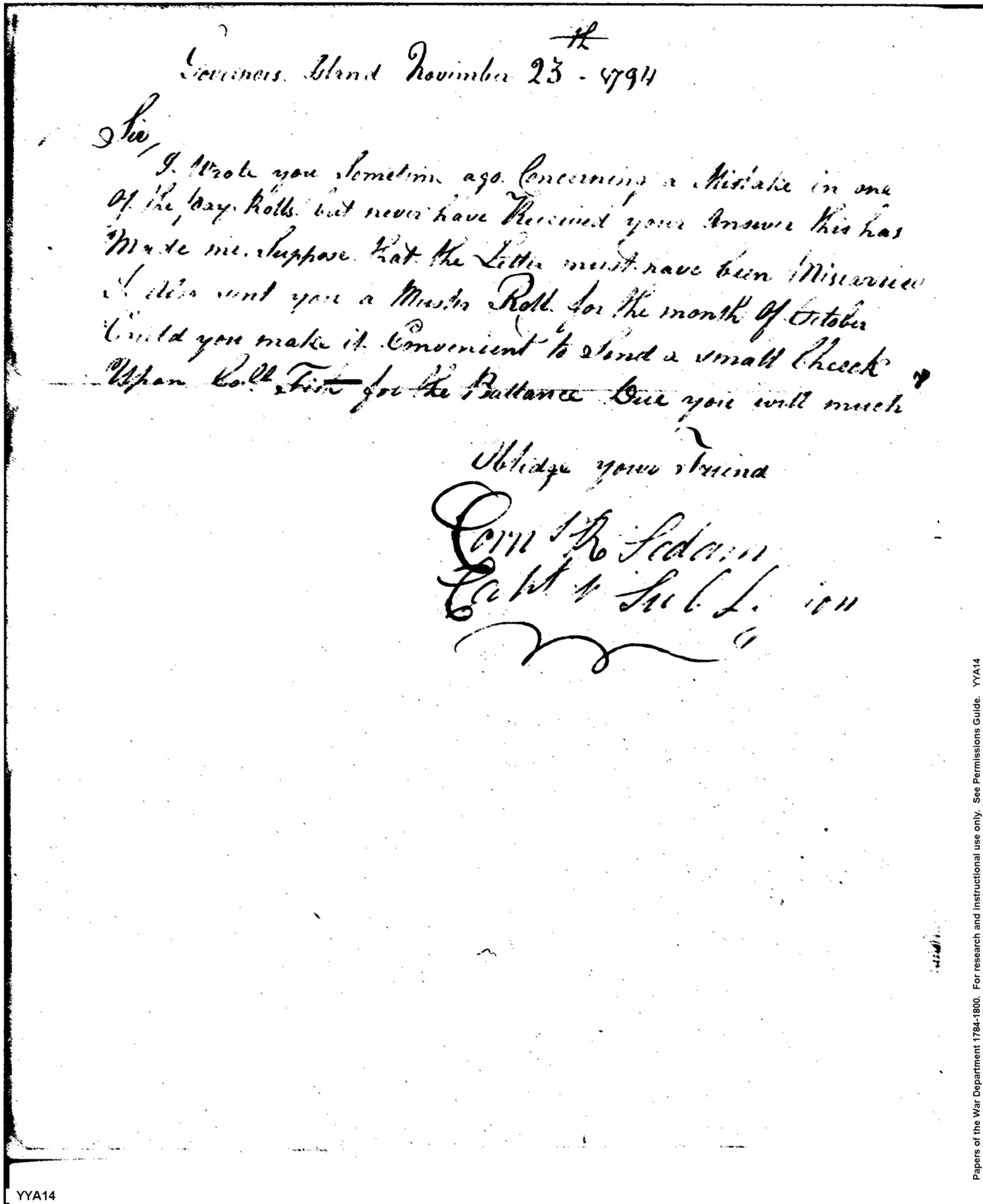 - Document: Request for Check Carried by Col. Fish for Balance Due Muster Roll