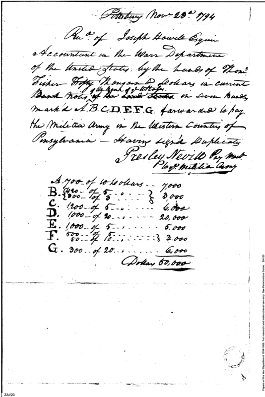 - Document: Receipt for payment of militia army called into service by President of United States for suppression of insurrection in frontier counties of Pennsylvania