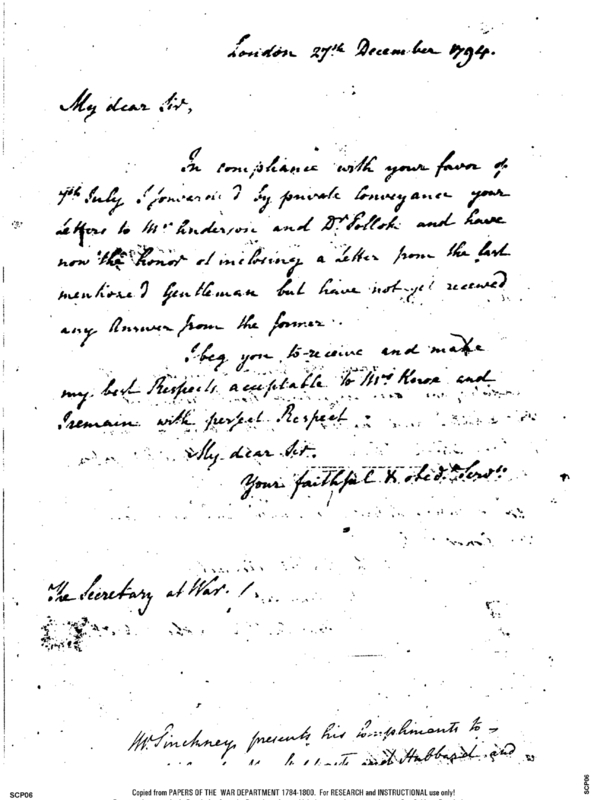- Document: William Pinckney presents his compliments to the new Secretary of War
