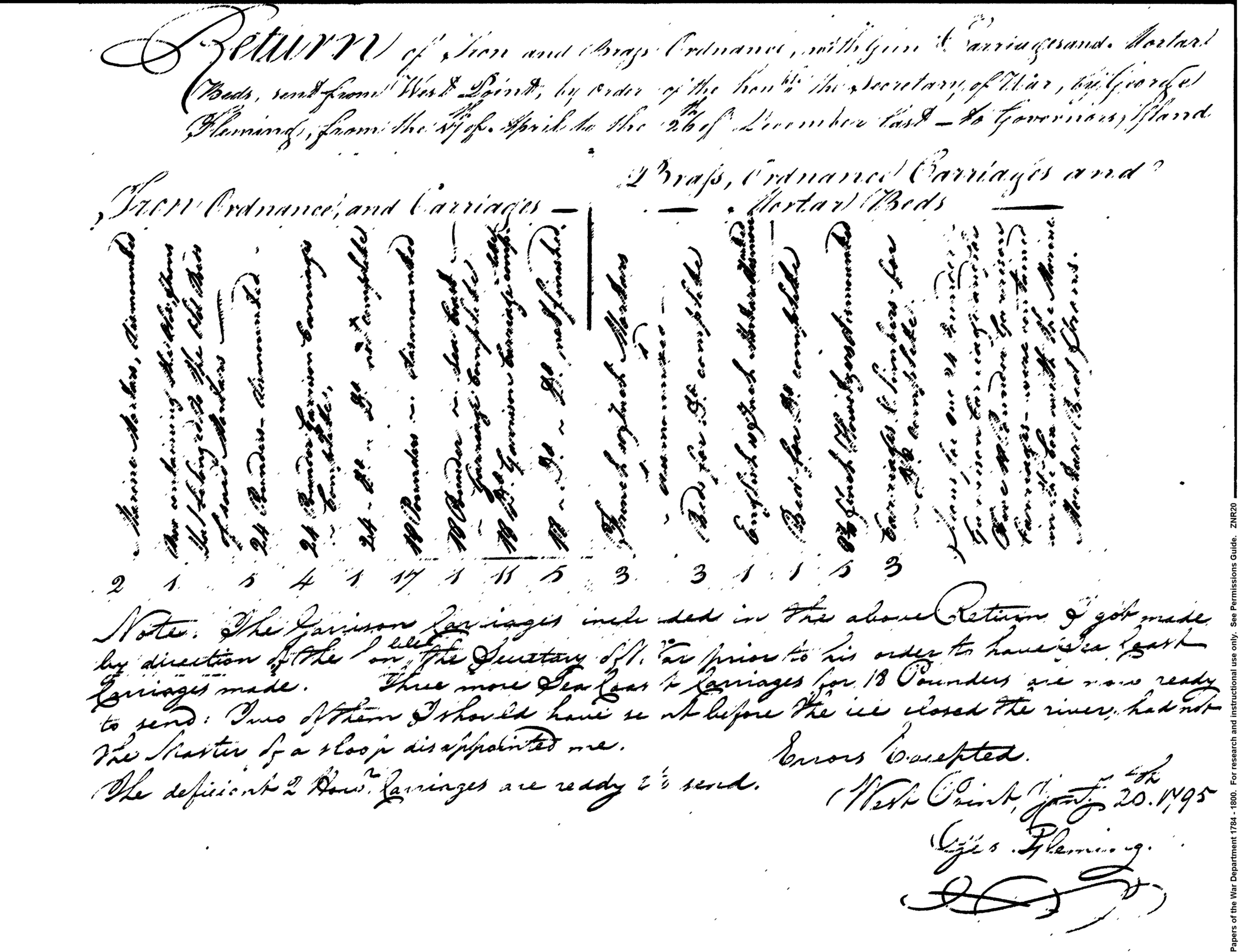 - Document: Return of Ordnance sent from West Point to Governors Island