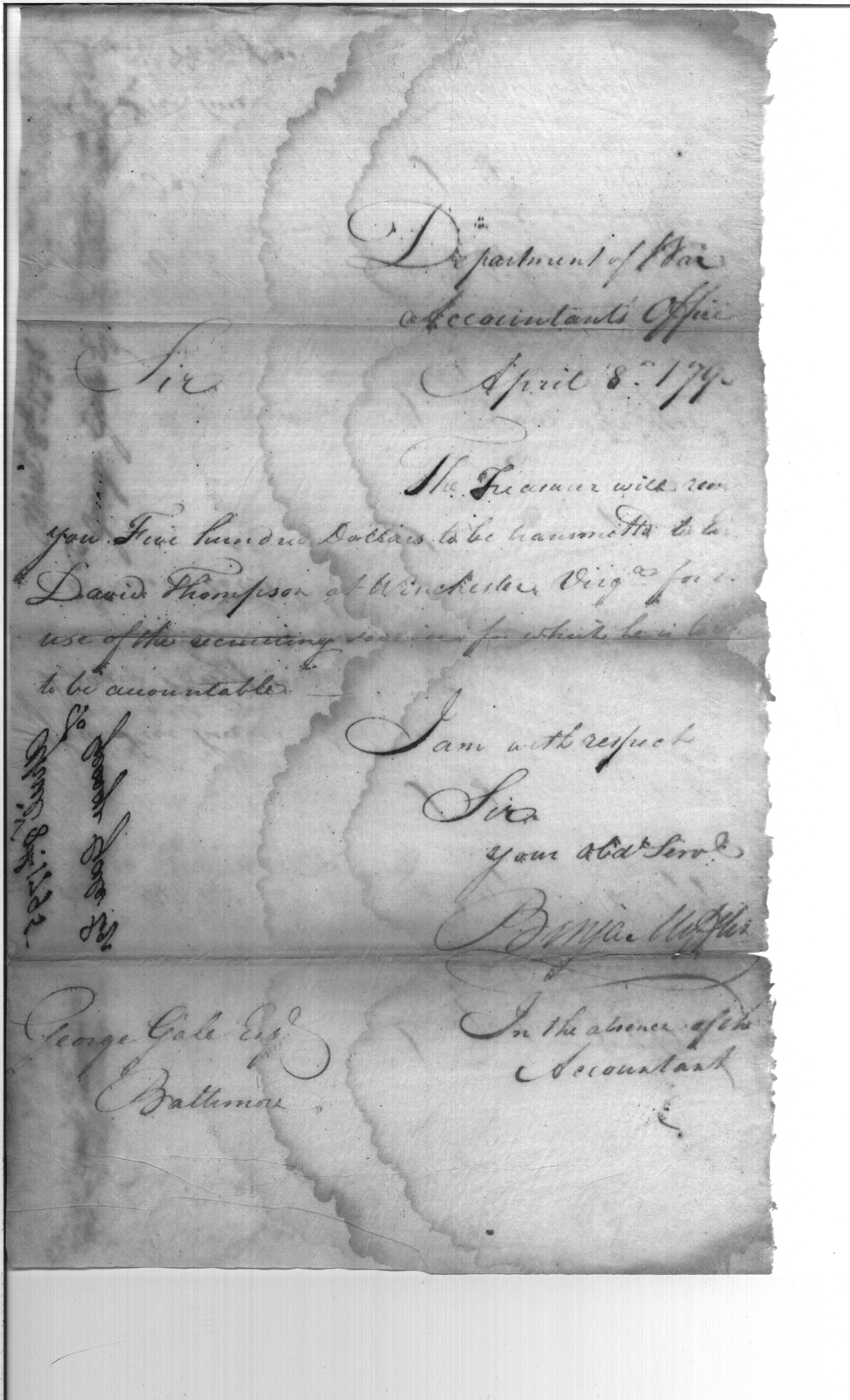 - Document: Money for Ensign David Thompson at Winchester.