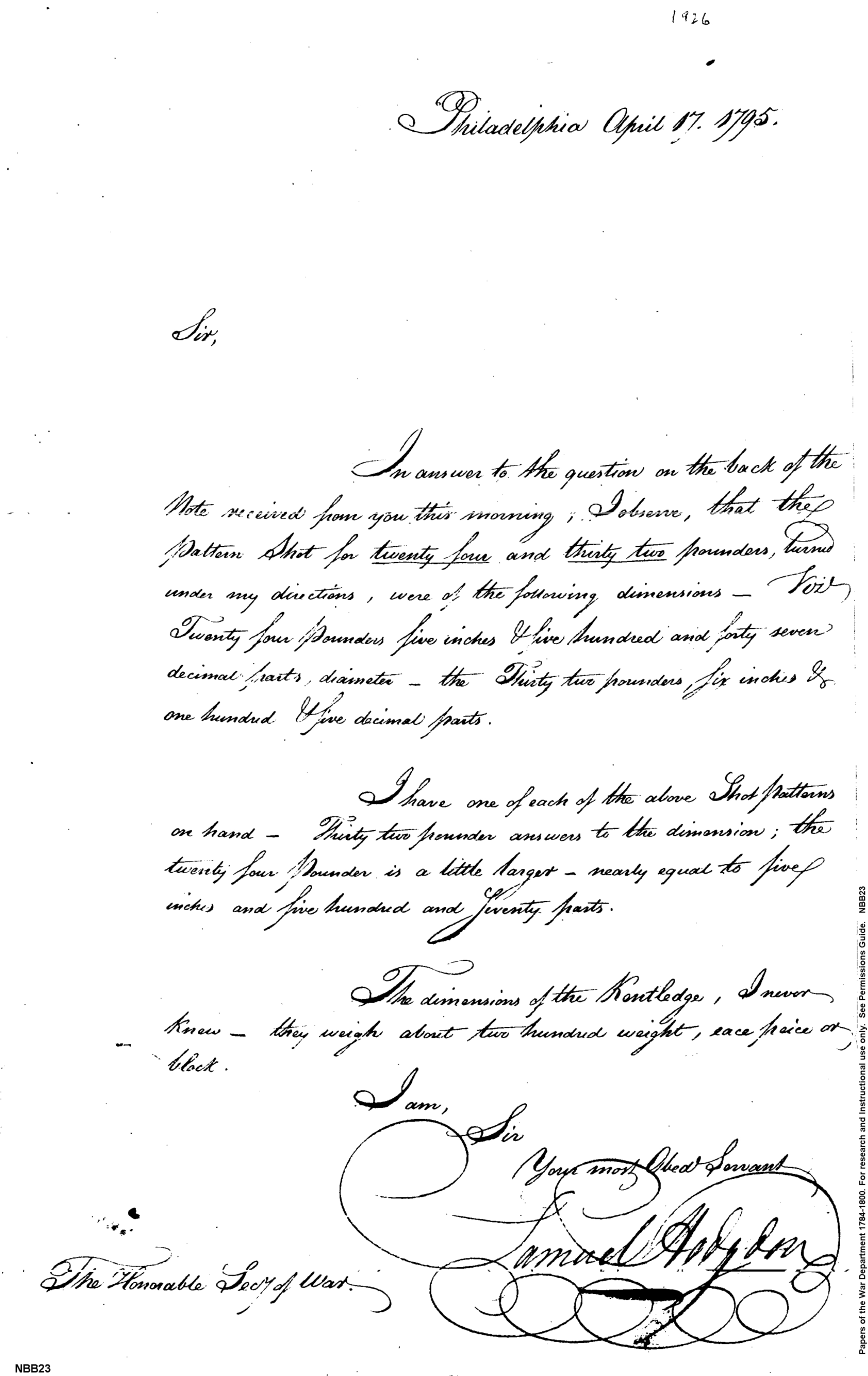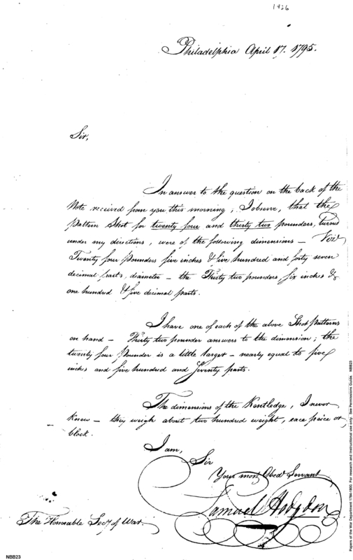 - Document: Replying to an inquiry as to the dimensions of shot and kentledge