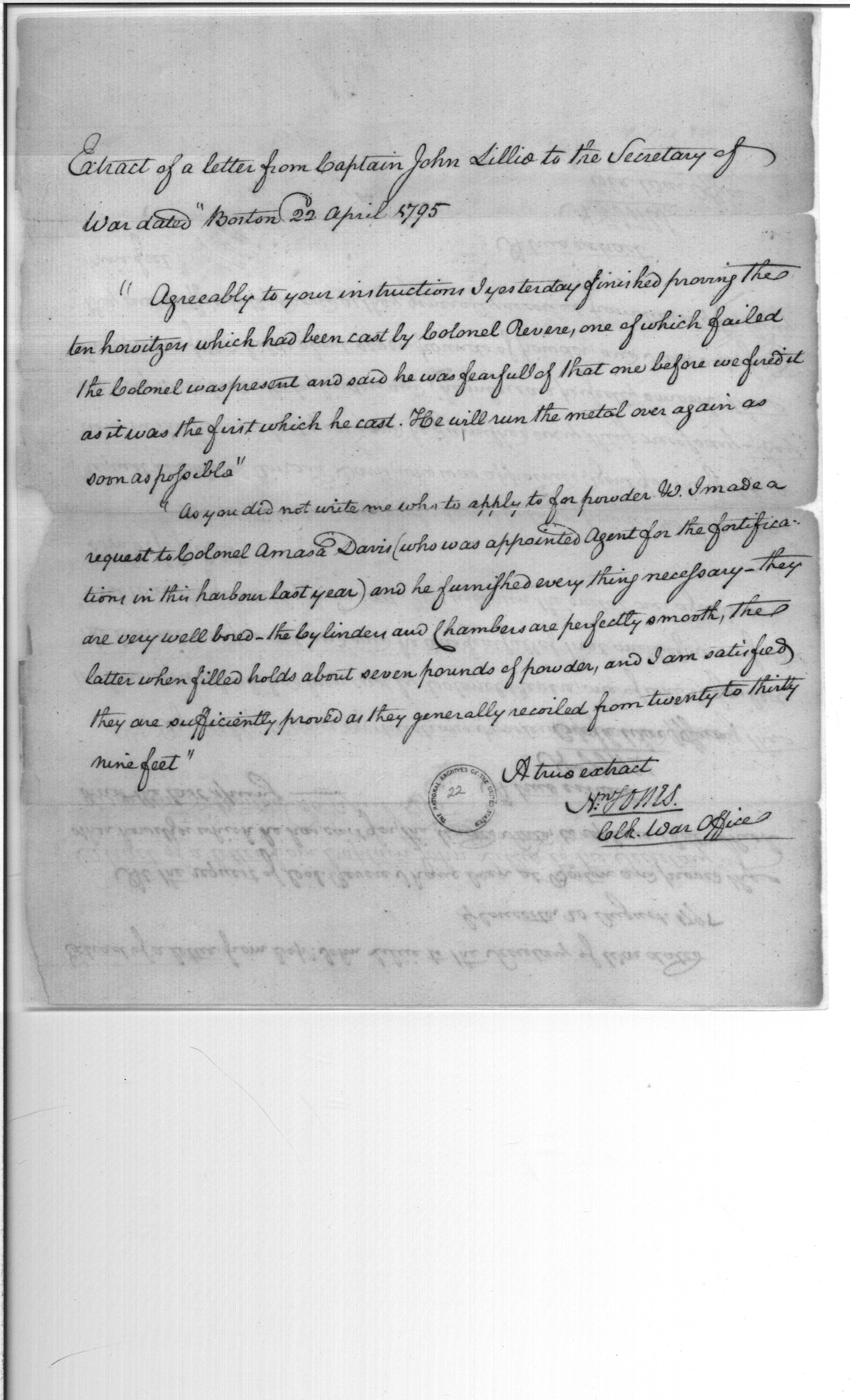 - Document: [Extract of letter from Captain John Lillio to the Secretary of War]