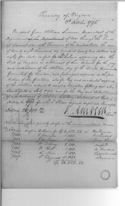 - Document: Jaquelin Ambler receipt of Simmons for pay, subsistence of militia