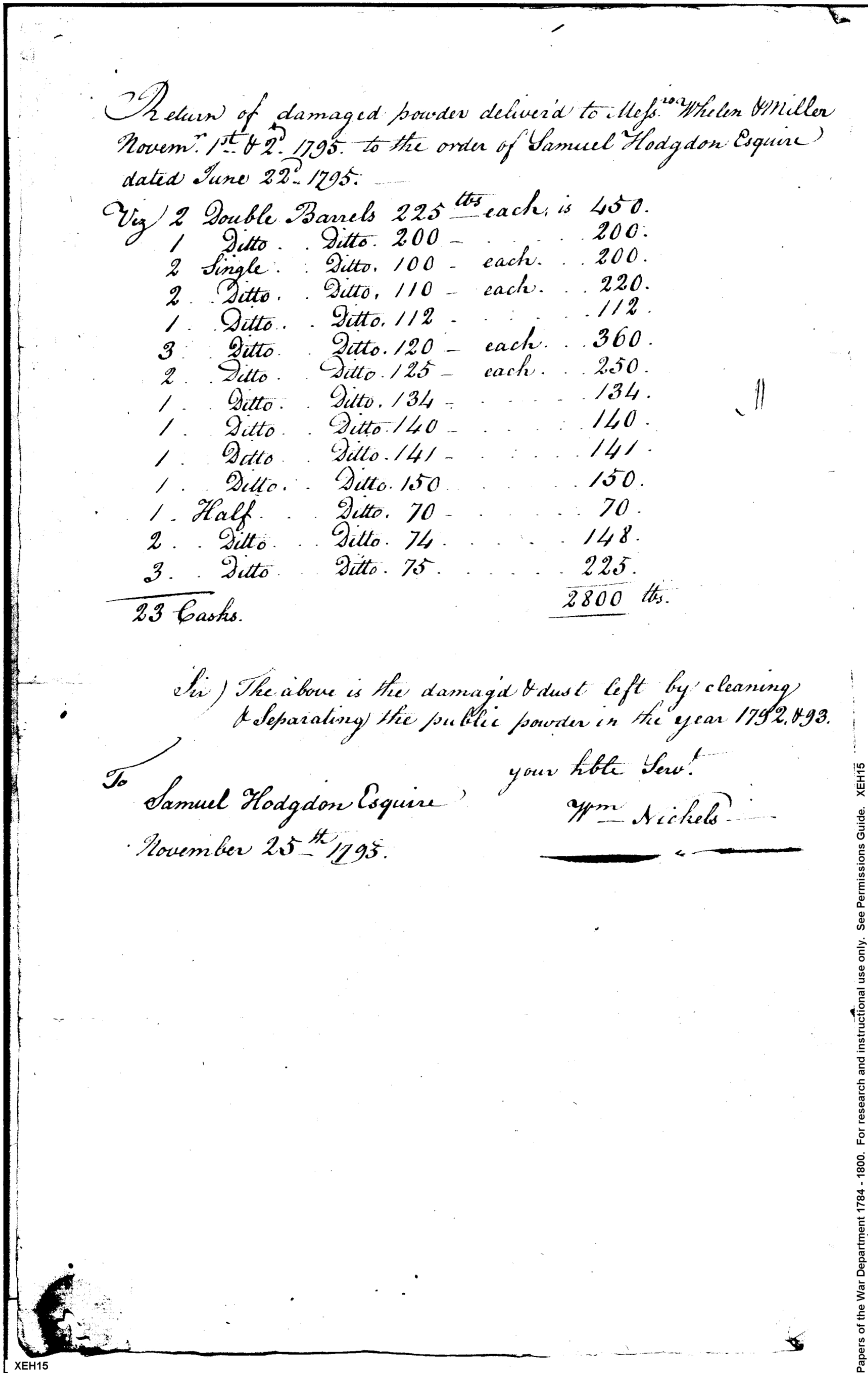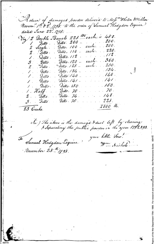 Document ViewerReturn of damaged powder delivered to Messrs Whelen & Miller November 1st & 2nd 1795 to the order of Samuel Hodgdon Esquire dated June 22d 1795