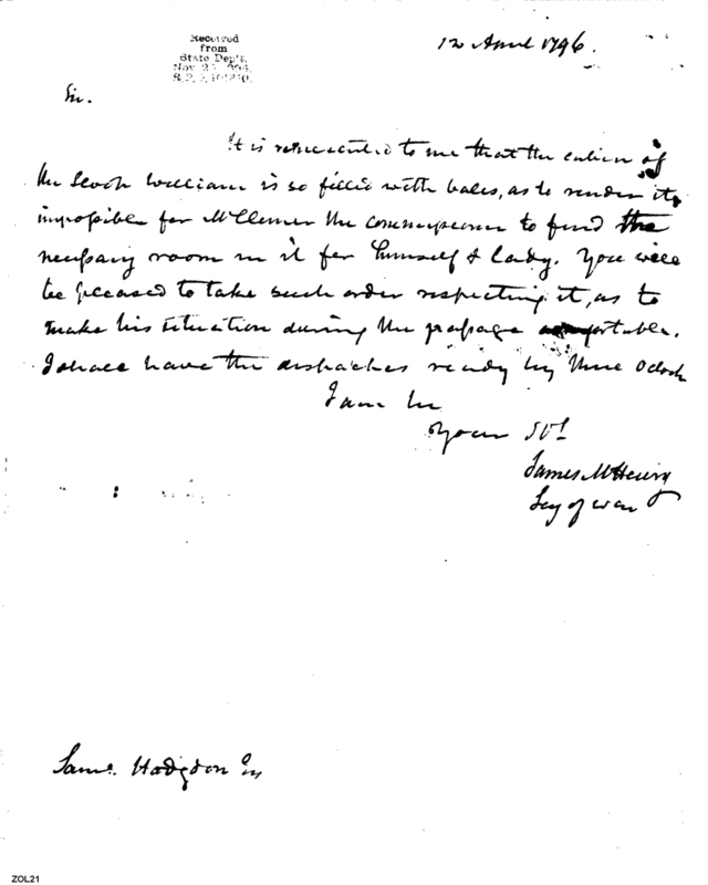 - Document: Requests that the Sloop William be Made Comfortable for Mr. & Mrs. Clemson