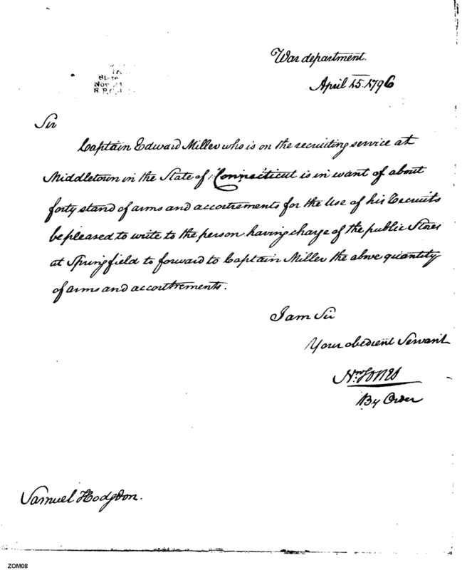 - Document: Requests Arms and Accoutrements for Recruits in Middletown, Connecticut