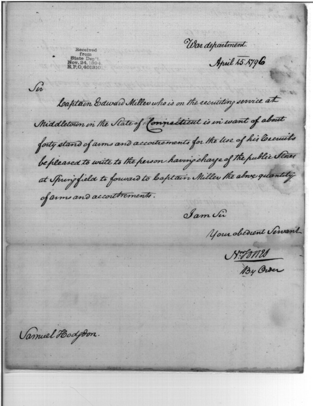 - Document: Requests Arms and Accoutrements for Recruits in Middletown, Connecticut
