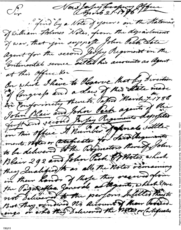 - Document: Details on John Blair and John Peck, Agents for Regiments in Continental Service