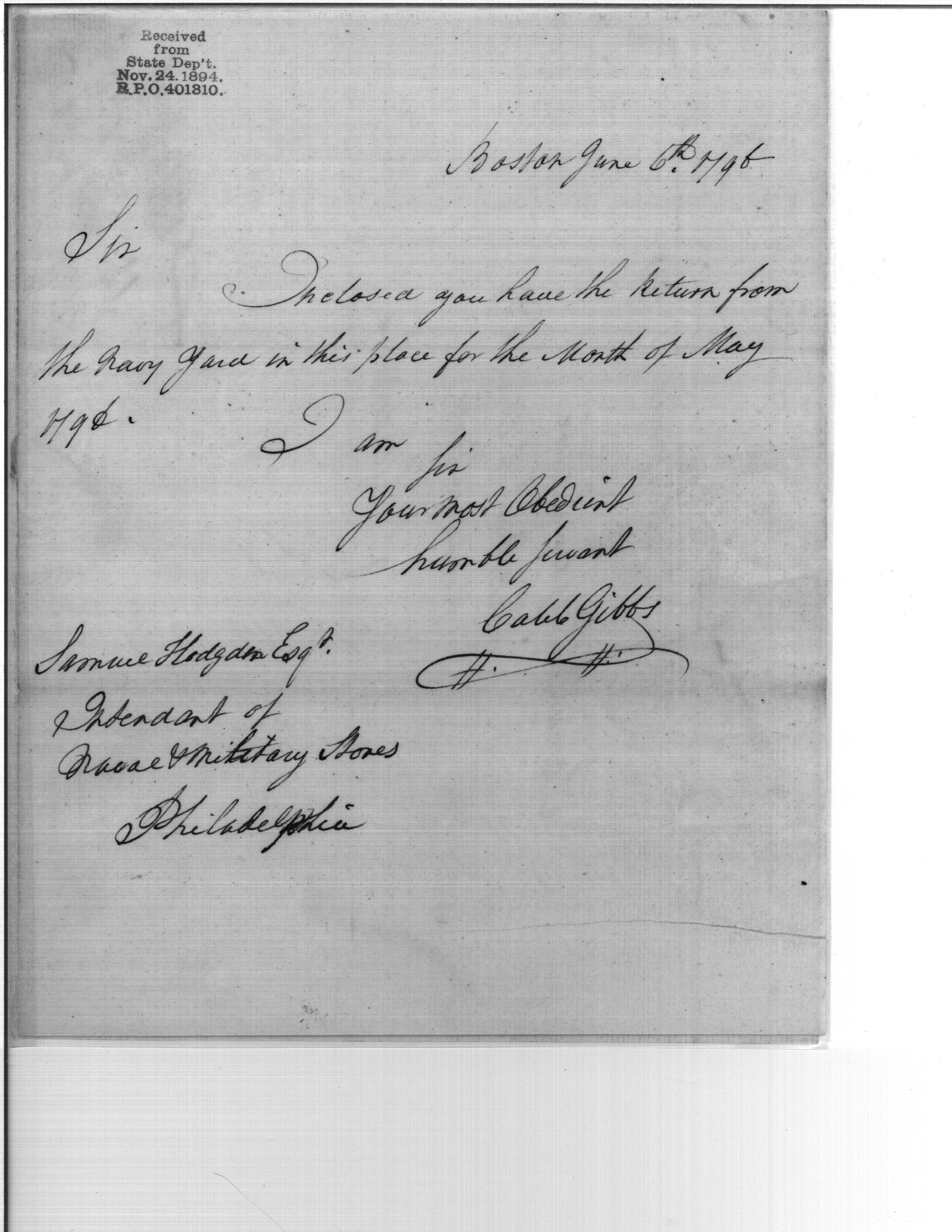 - Document: Submission of Returns for May 1796 for the Boston Navy Yard