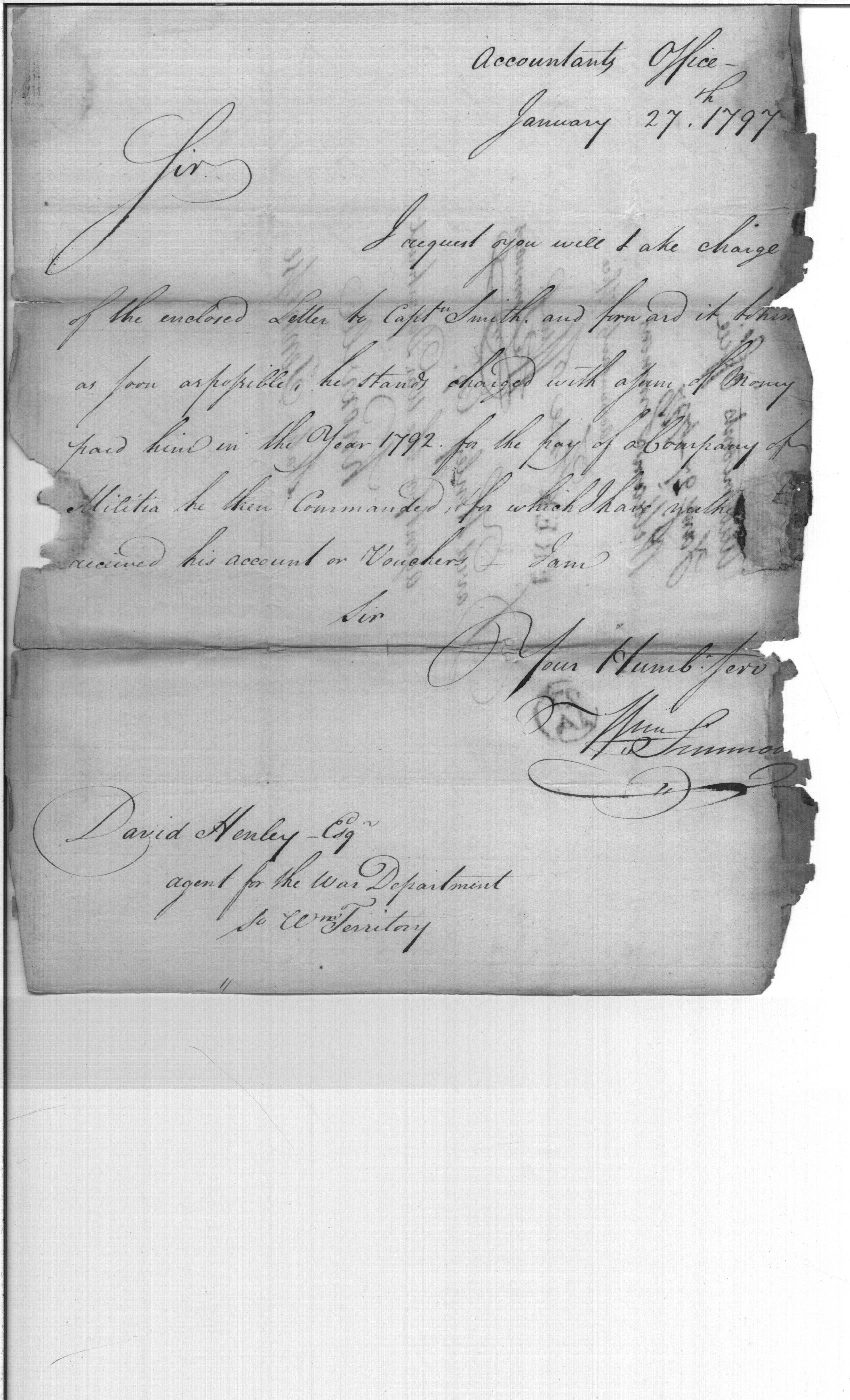 - Document: Letter for David Henley regarding Captain Smith delinquent account and vouchers