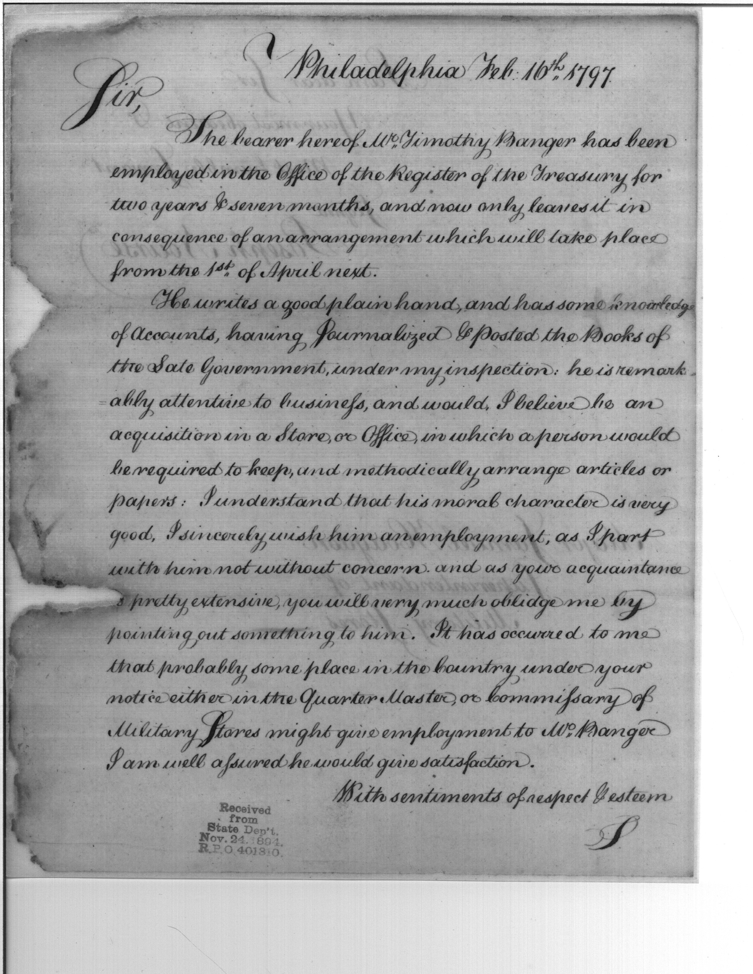 - Document: Recommendation of Timothy Banger for Employment