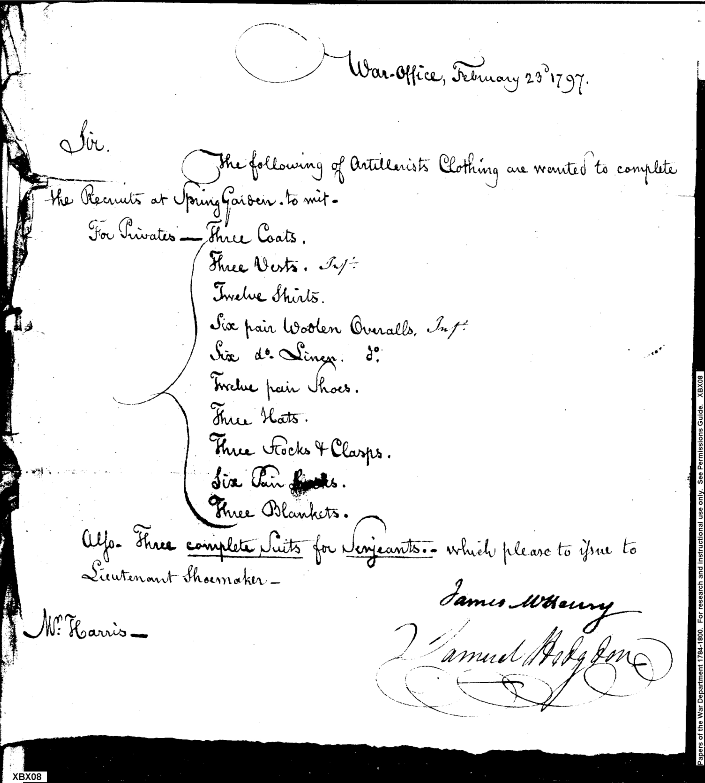 Document ViewerRequest for Delivery of Artillerists' Clothing for New Recruits
