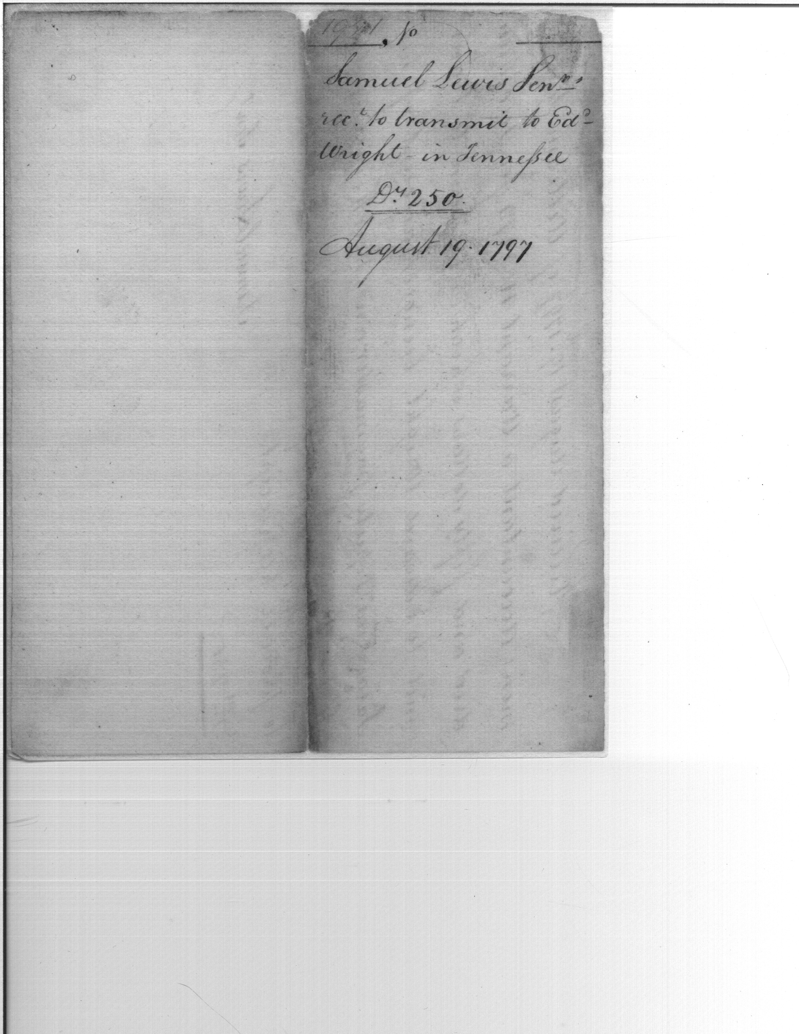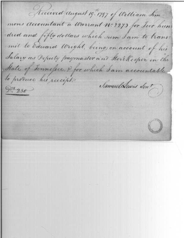 - Document: Receipt of William Simmons warrant to Edward Wright for salary deputy paymaster and store keeper Tennessee