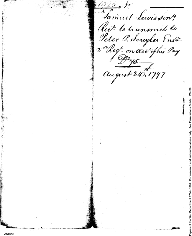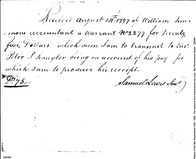 - Document: Receipt for warrant from William Simmons to Samuel Lewis for transmit to Ensign Peter P. Schuyler