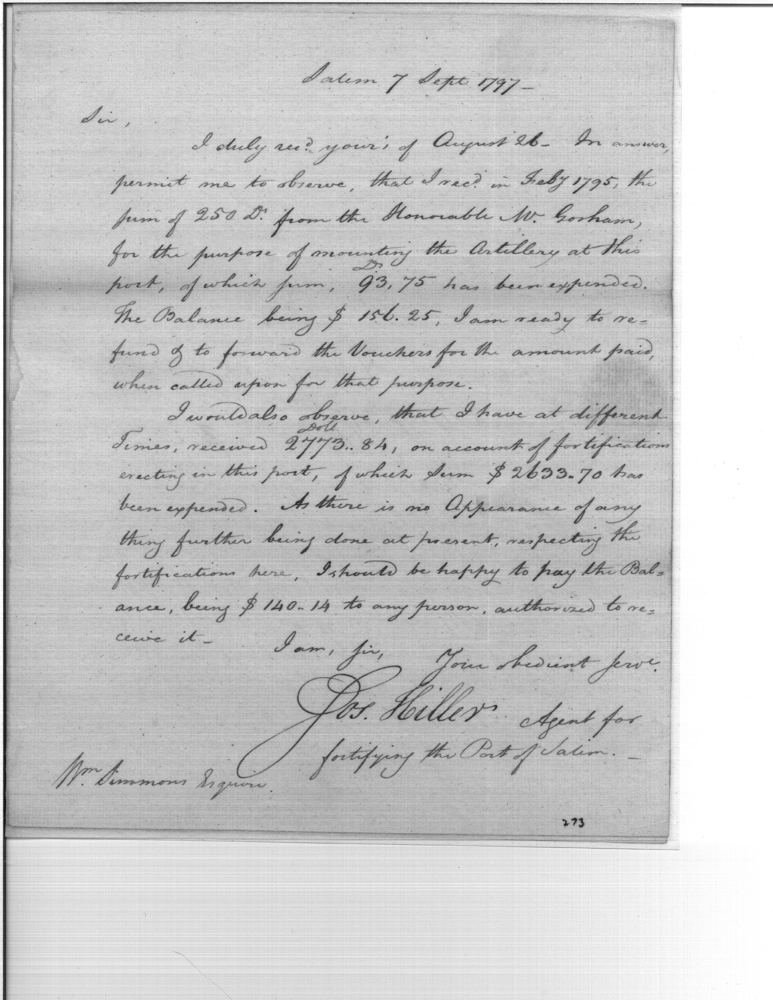 - Document: Offer to Pay Remaining Balance from Expenses on Mounting Artillery and Cost of Fortifications at Port of Salem