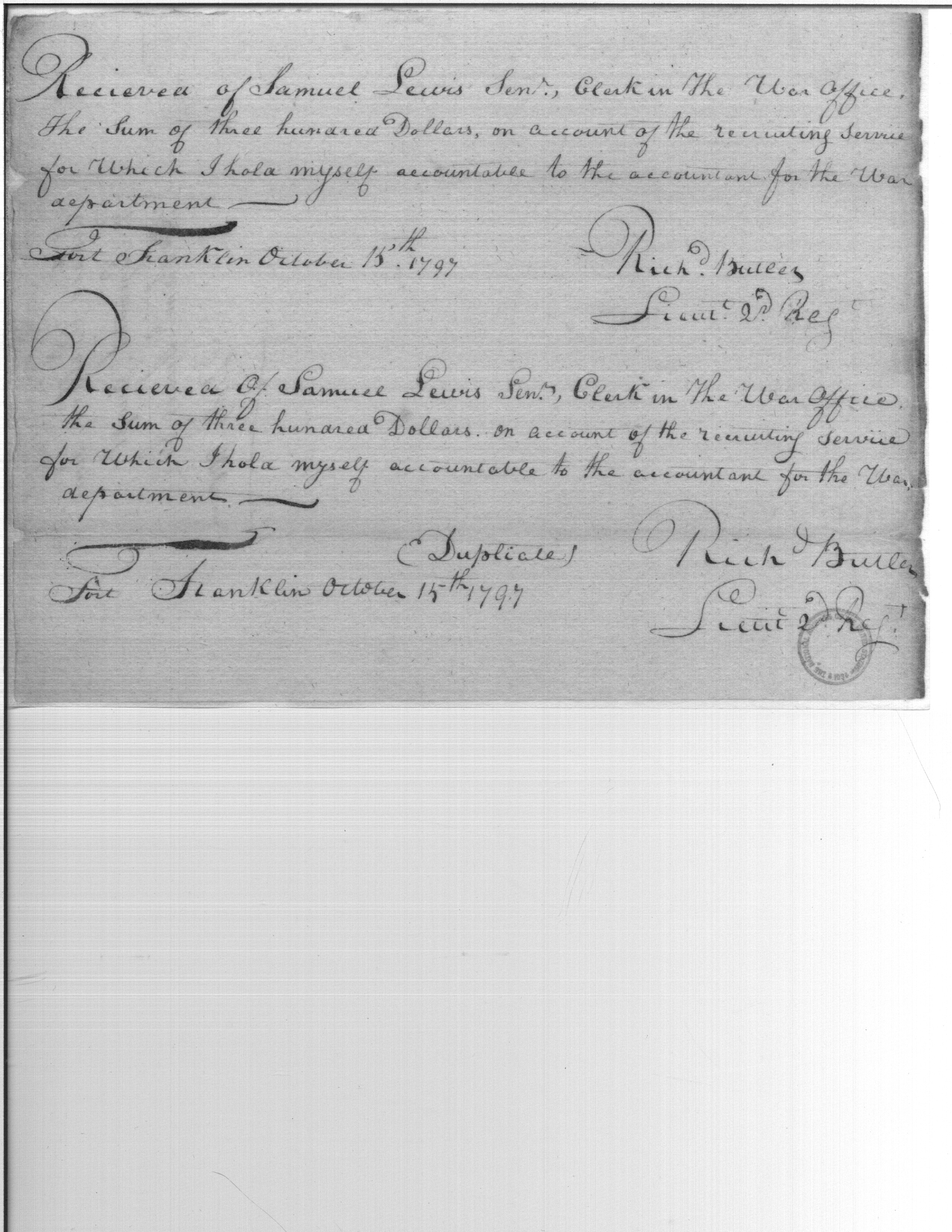 - Document: Receipt of Samuel Lewis to Richard Butler on account of the recruiting service