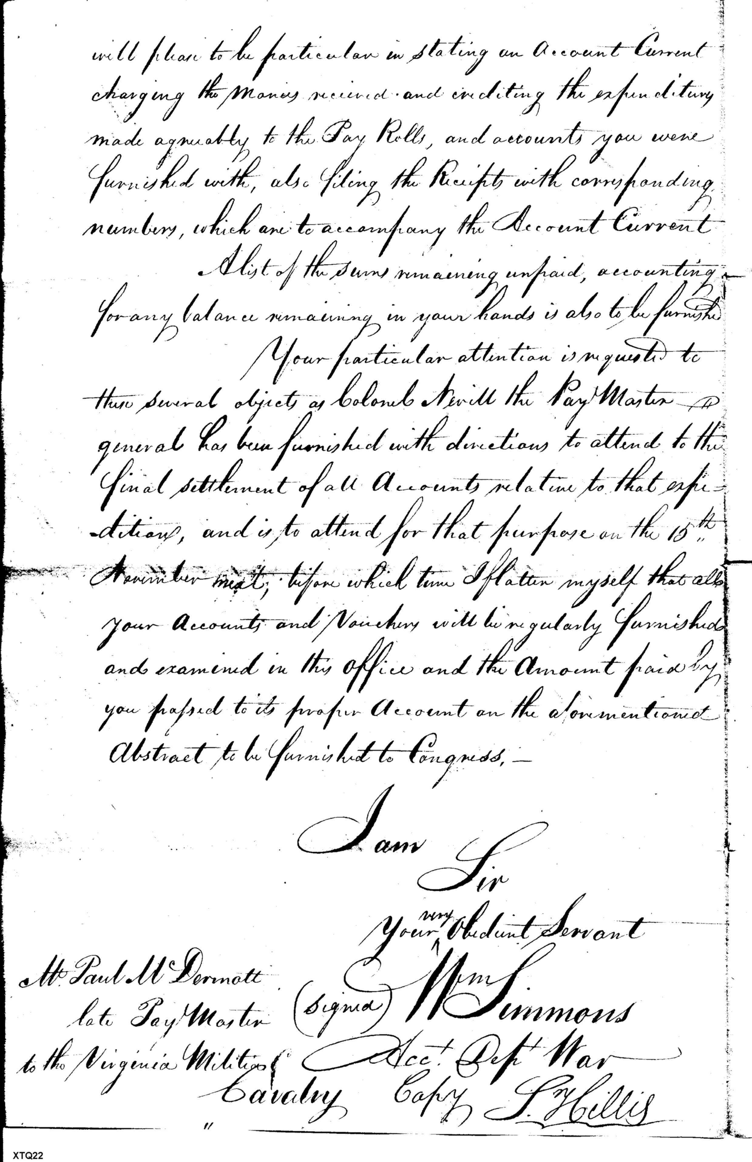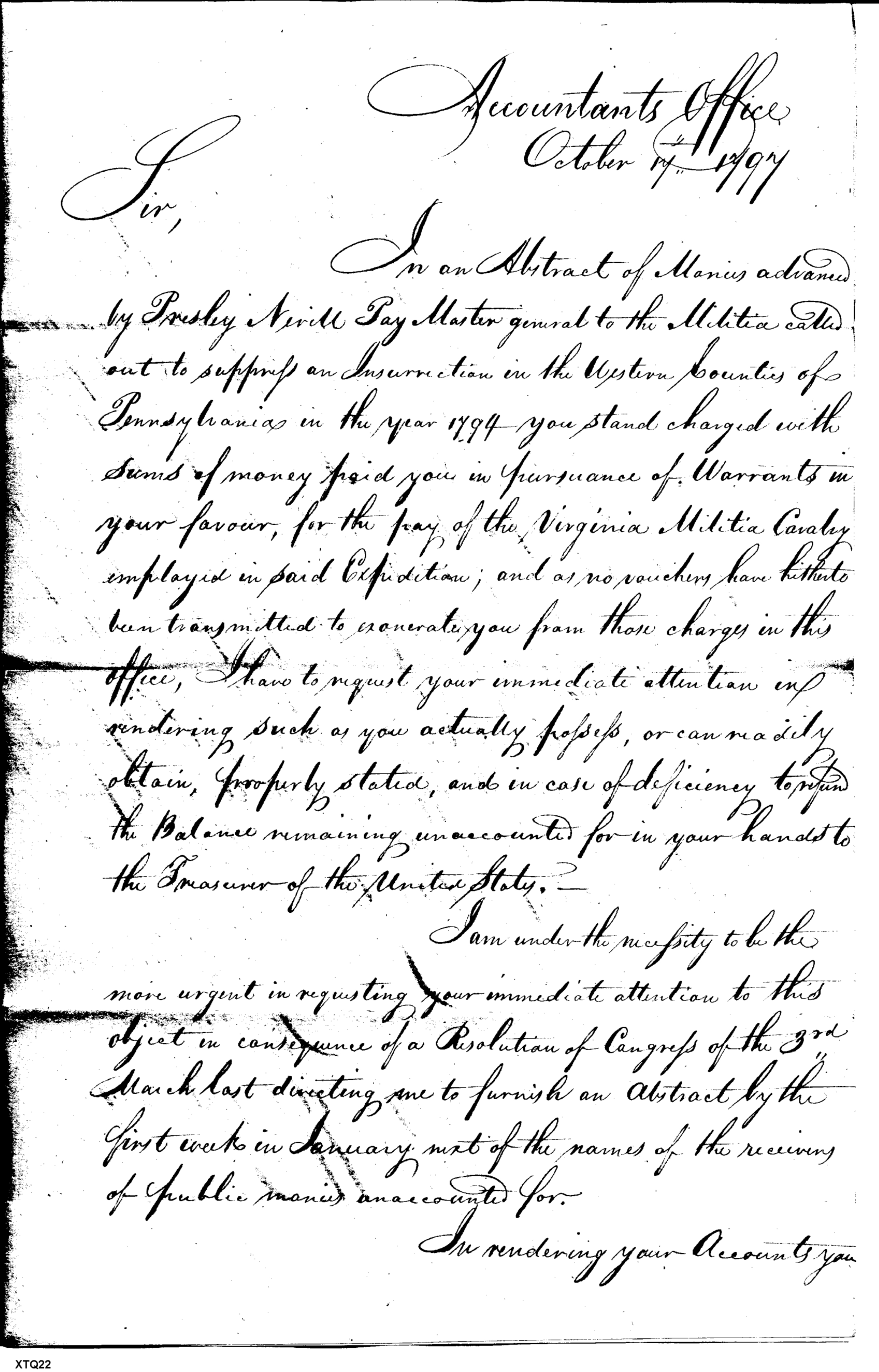 - Document: Monies advanced to paymaster Presley Nevill paymaster general to militia