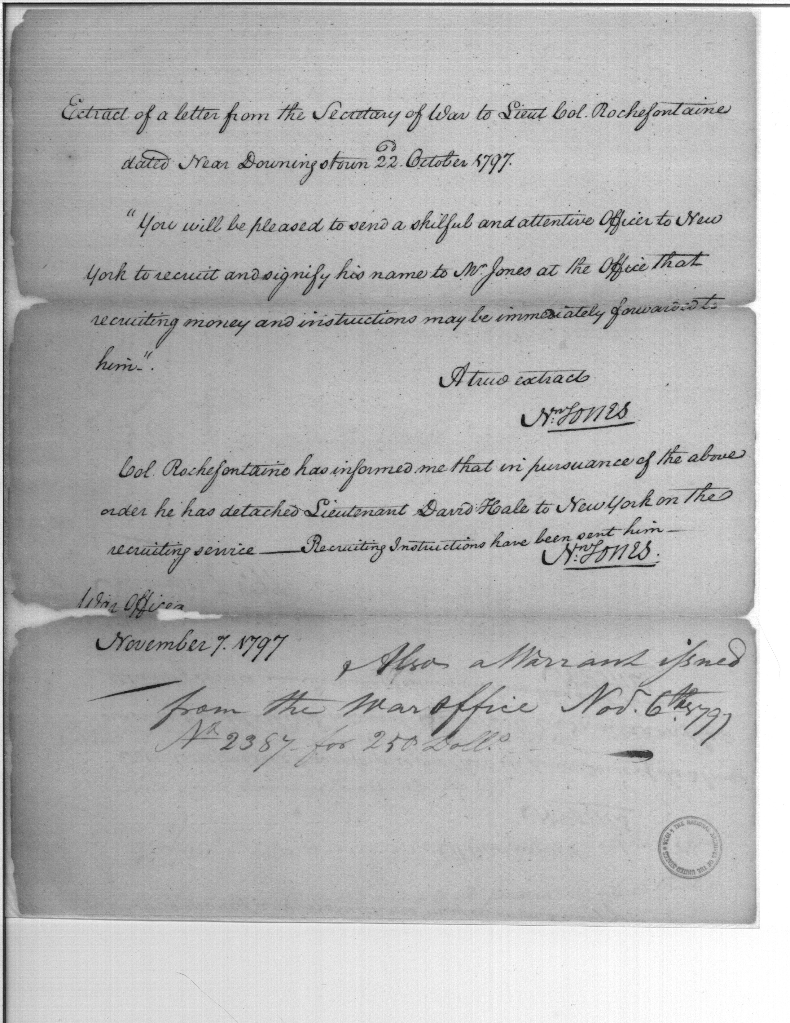 - Document: Extract from Secretary of War to Colonel Rochefontaine to send officer to New York to recruit