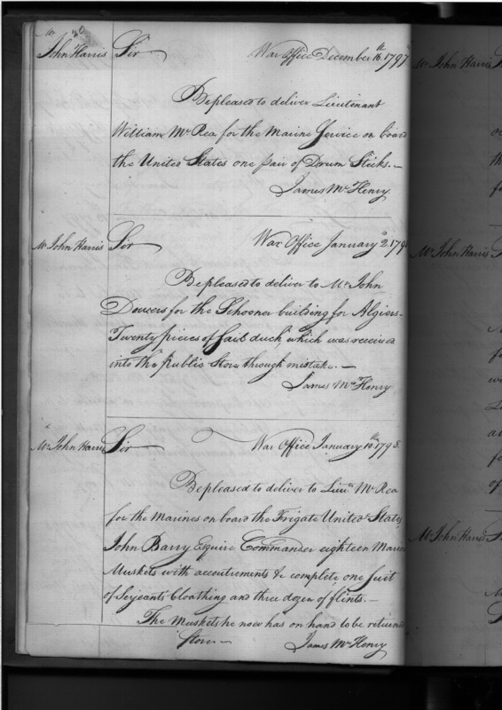 - In source: Collection: Orders to Deliver Naval Ordinance (Correspondence on Arming and Equipping Early Frigates and Ships of War When Navy was under War Department), May 1795-July 1798. (RG45)