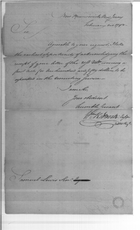 - Document: Ensign William R Boote at New Brunswick recruiting service acknowledge receipt of letter from Samuel Lewis