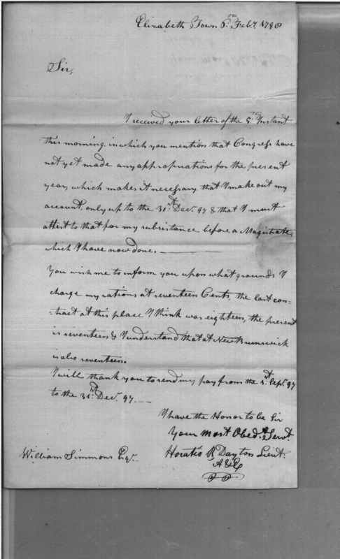 Document ViewerLetter regarding account, congressional appropriations, charge of rations from Lieutenant Horatio Dayton, Artillery and Engineers to William Simmons