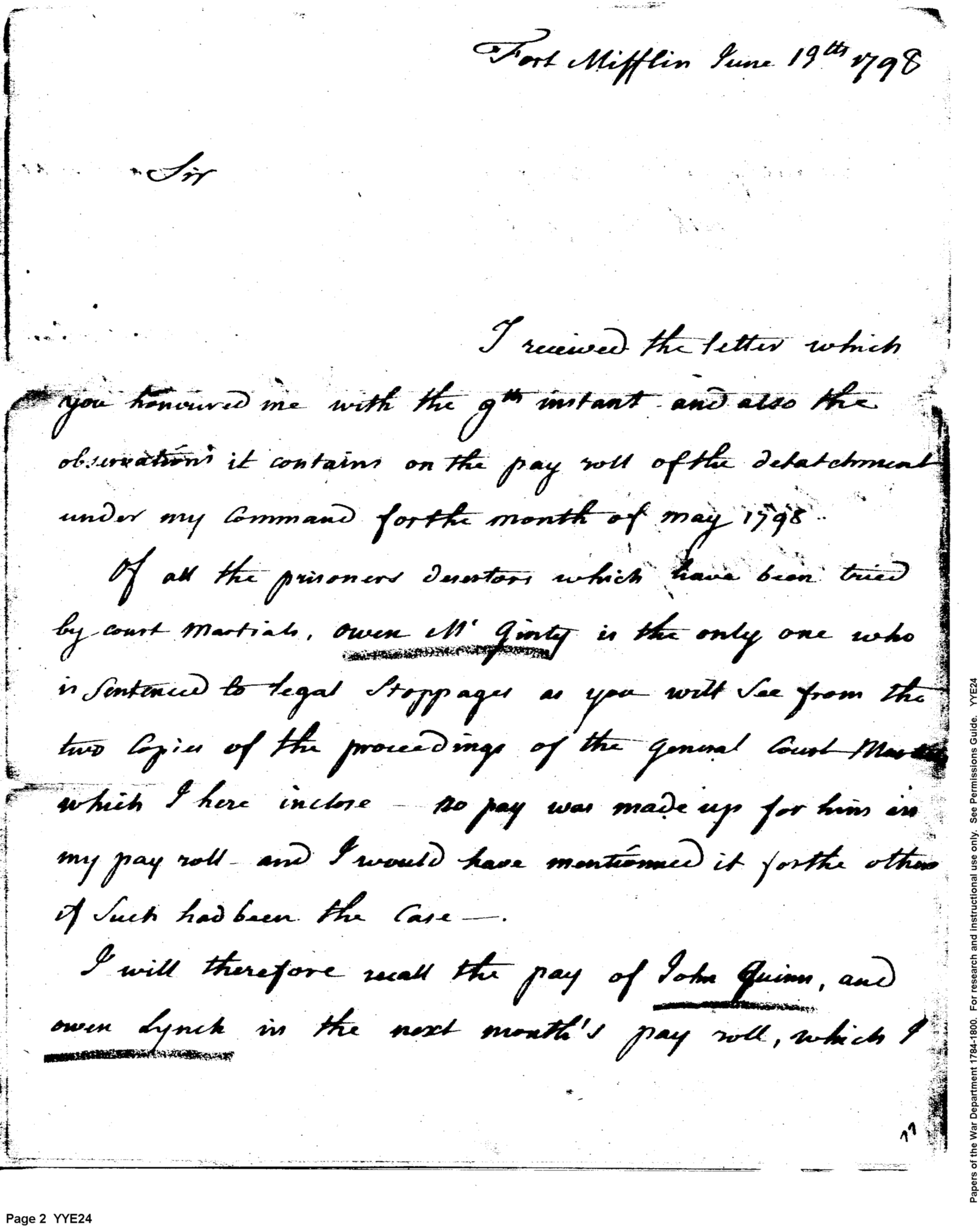 - Document: Owen McGinty Sentenced to Pay Stoppages, Two Copies of Court Martial Enclosed