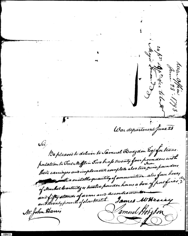 - Document: Request for Issue of Cannon, Arms & Accoutrements, & Ammunition to Fort Mifflin