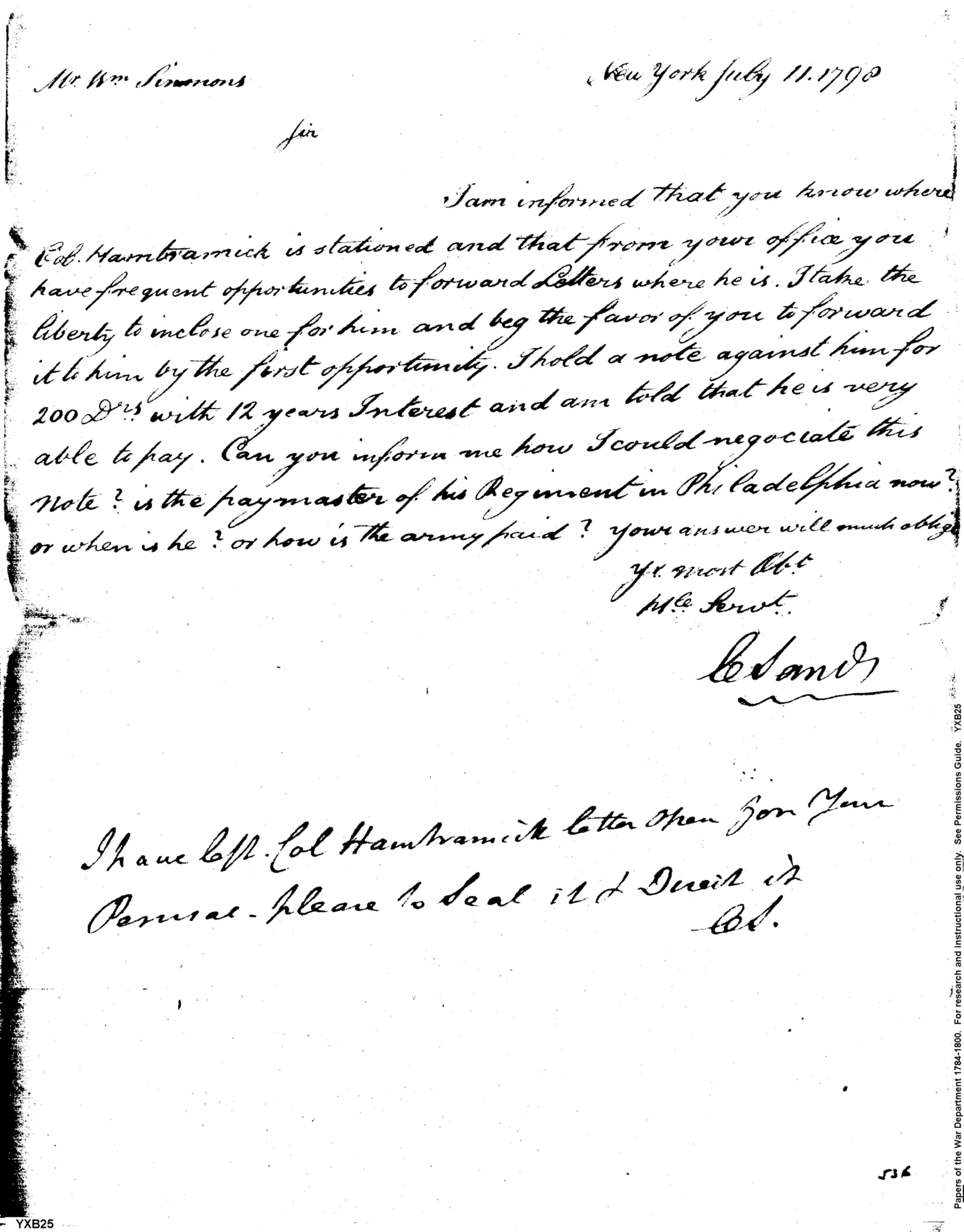 - Document: Request for Letter to be Forwarded to Col. Hamtramck