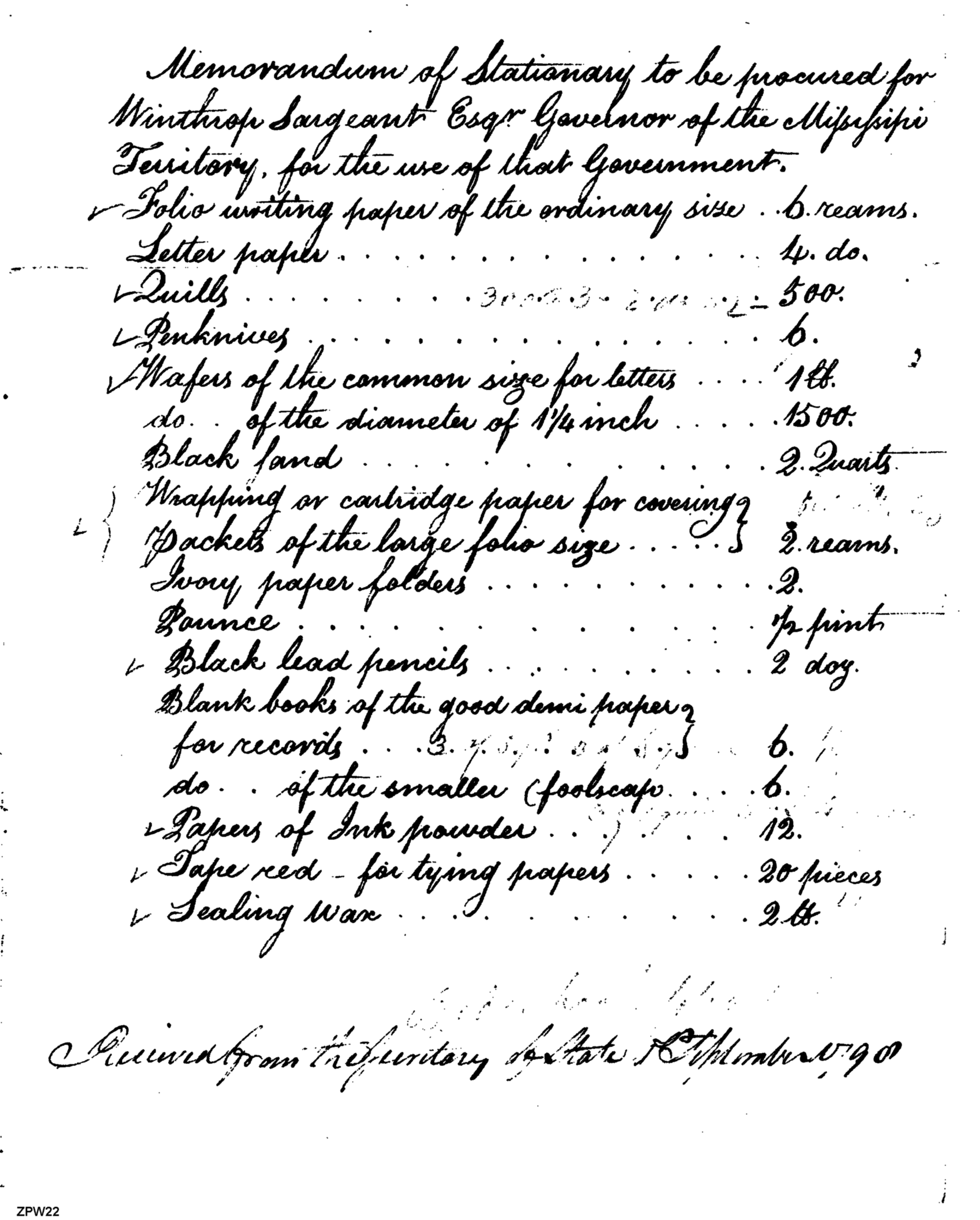 - Document: Stationery to be Procured for Winthrop Sargent