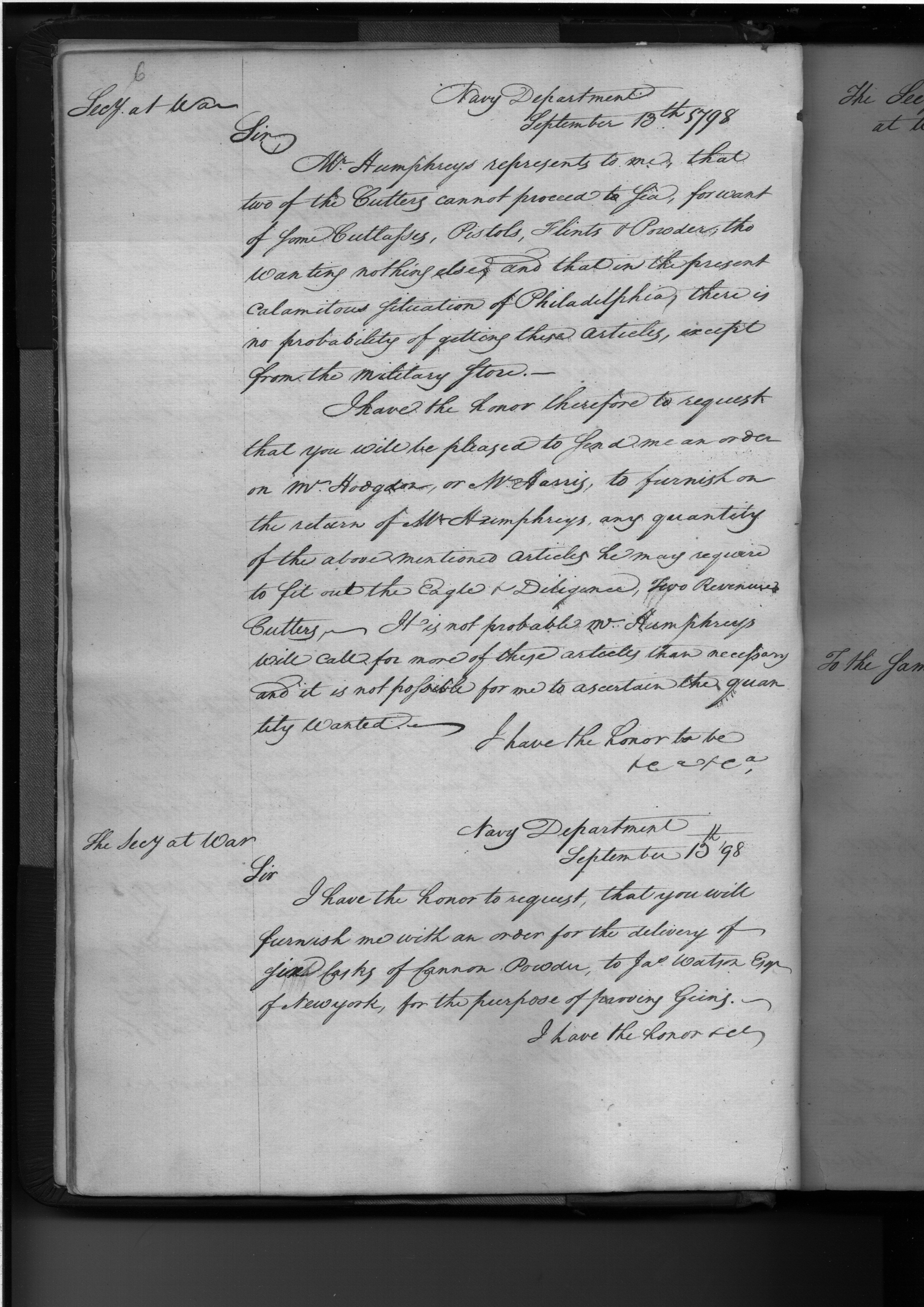 - In source: Collection: Letters Sent by the Secretary of the Navy to Federal Executive Agents (Letters to President, Secretary of State, Secretary of War, and Letters to (Requisitions on) Secretary of the Treasury and other Treasury Department Officials), June 1798-June 1824. (RG45)
