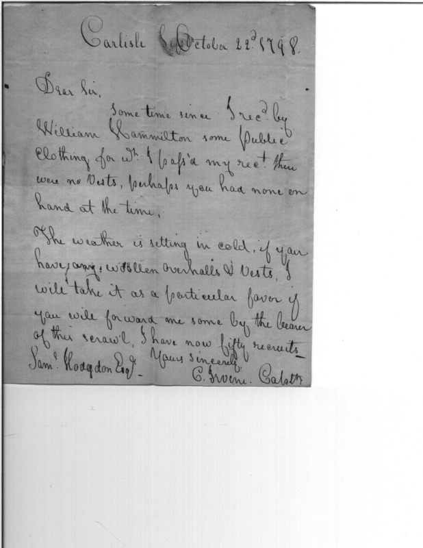 - Document: Letter from Captain Calender Irvine requesting vests for his troops