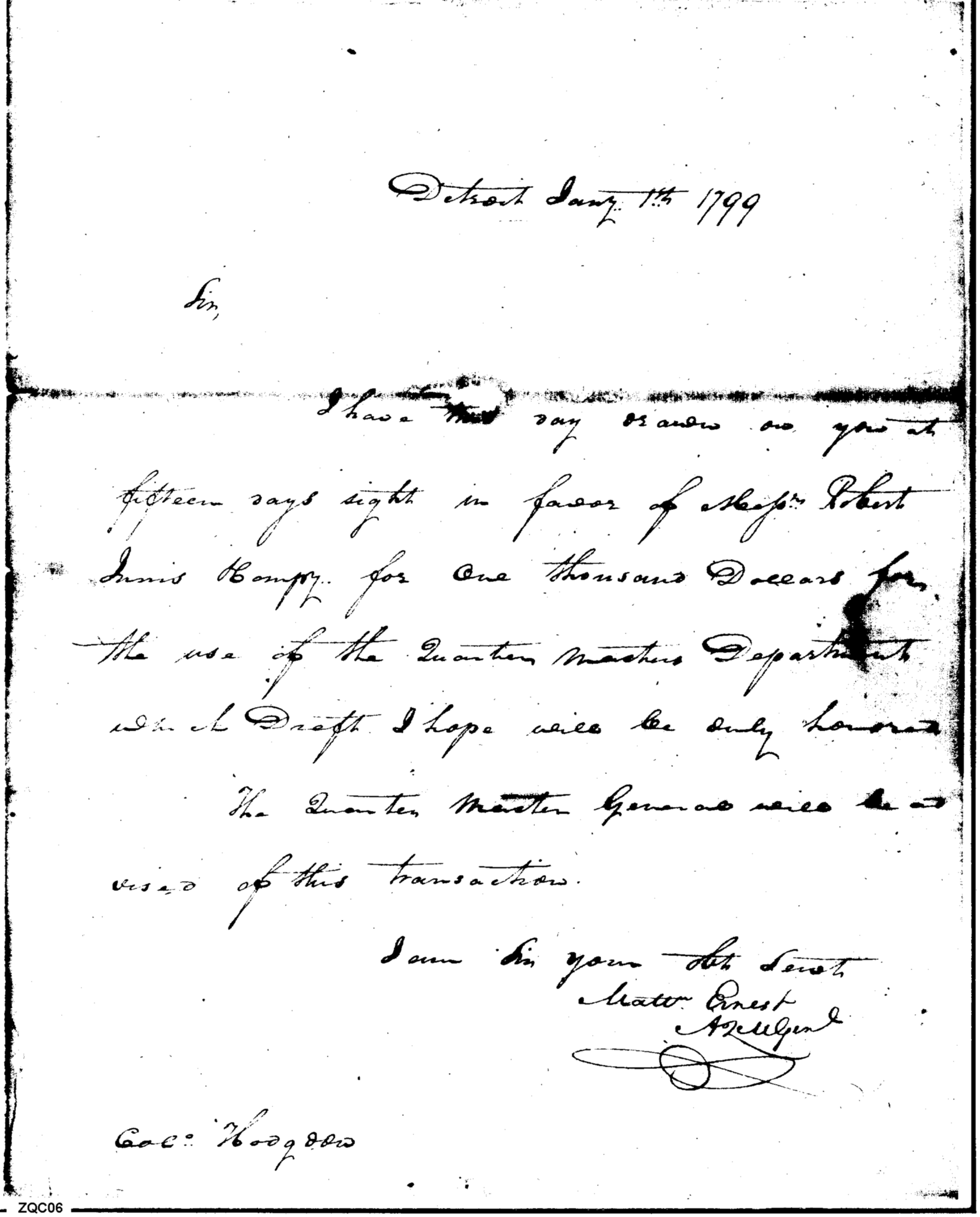 - Document: $1000 for the Quartermaster's Department