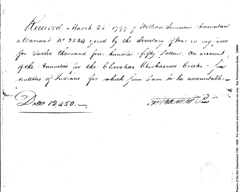- Document: Receipt of Tench Francis on account of the annuities for the Cherokees, Chickasaws, Creeks and Five Nations