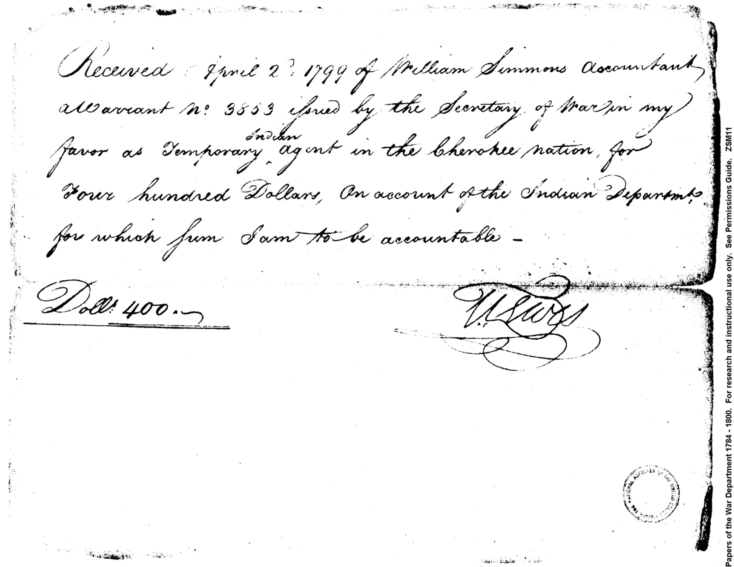 - Document: Receipt for pay as temporary Indian agent in the Cherokee nation