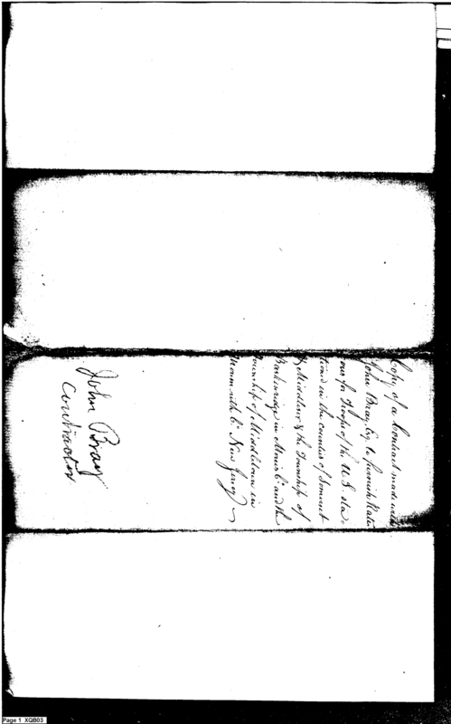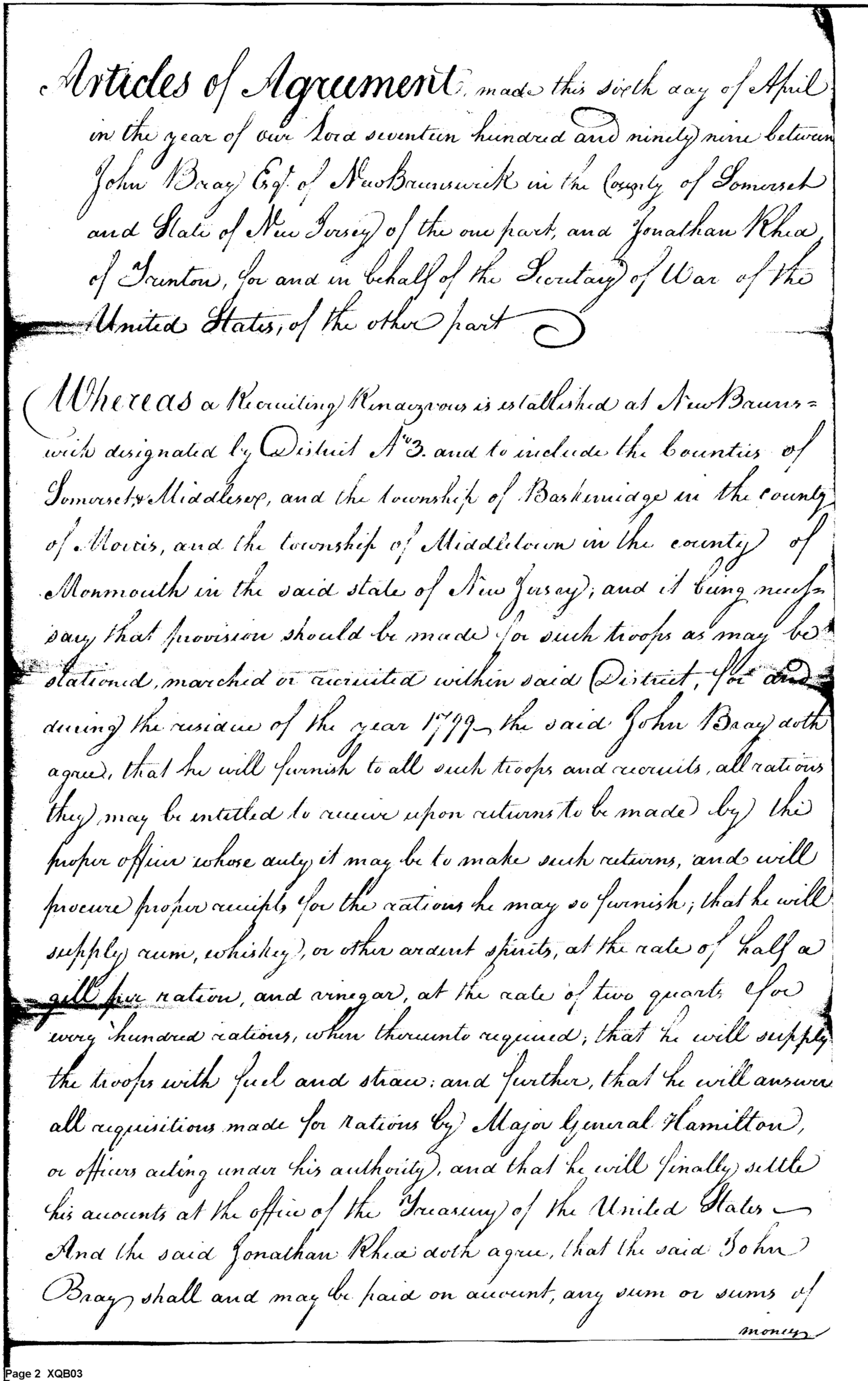 - Document: Copy of a contract made with John Bray to furnish rations for US troops in New Jersey counties of Somerset and Middlesex