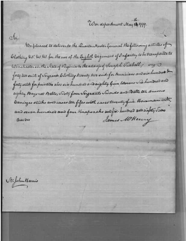 - Document: Request for Issue of Assorted Military Supplies to 8th Regiment at Winchester