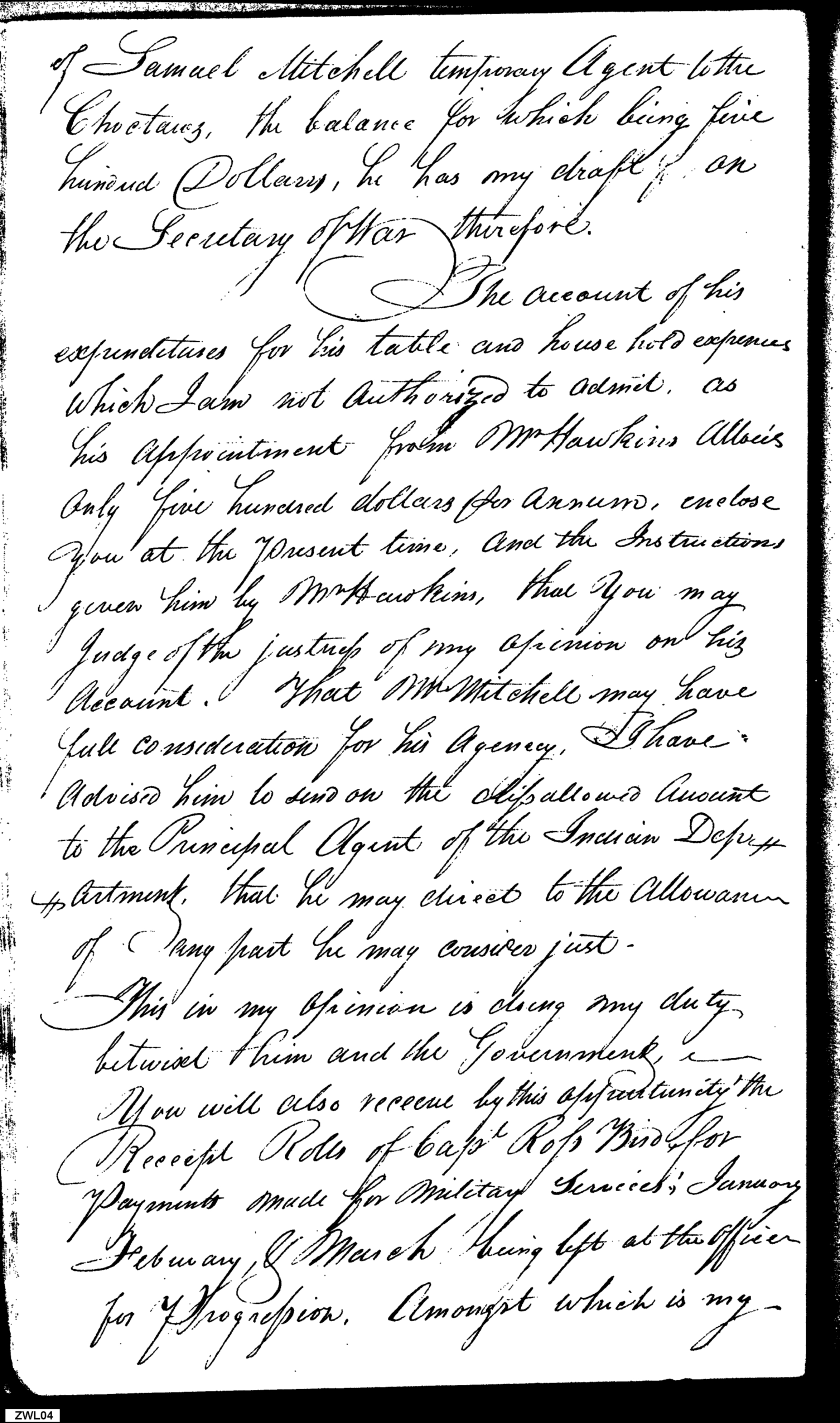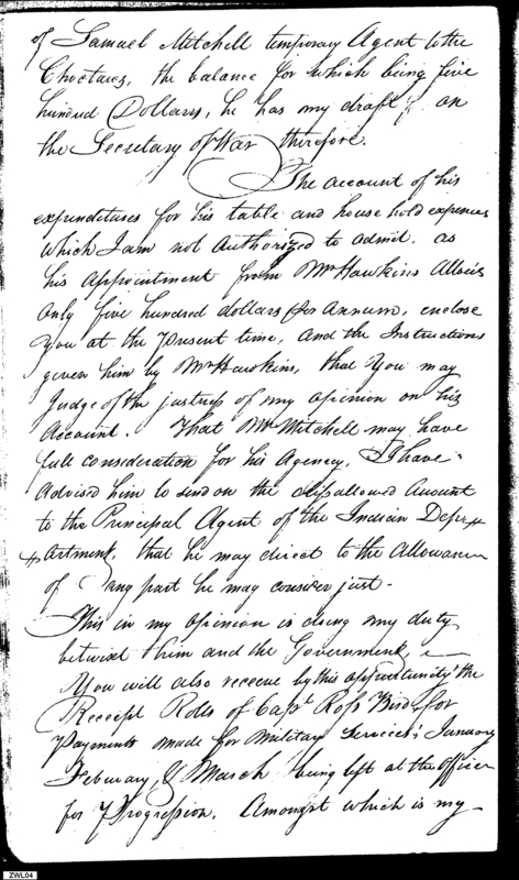 - Document: Continuation of Payments on Account for Treaty of Tellico; Accounts for Choctaw Agent Samuel Mitchell