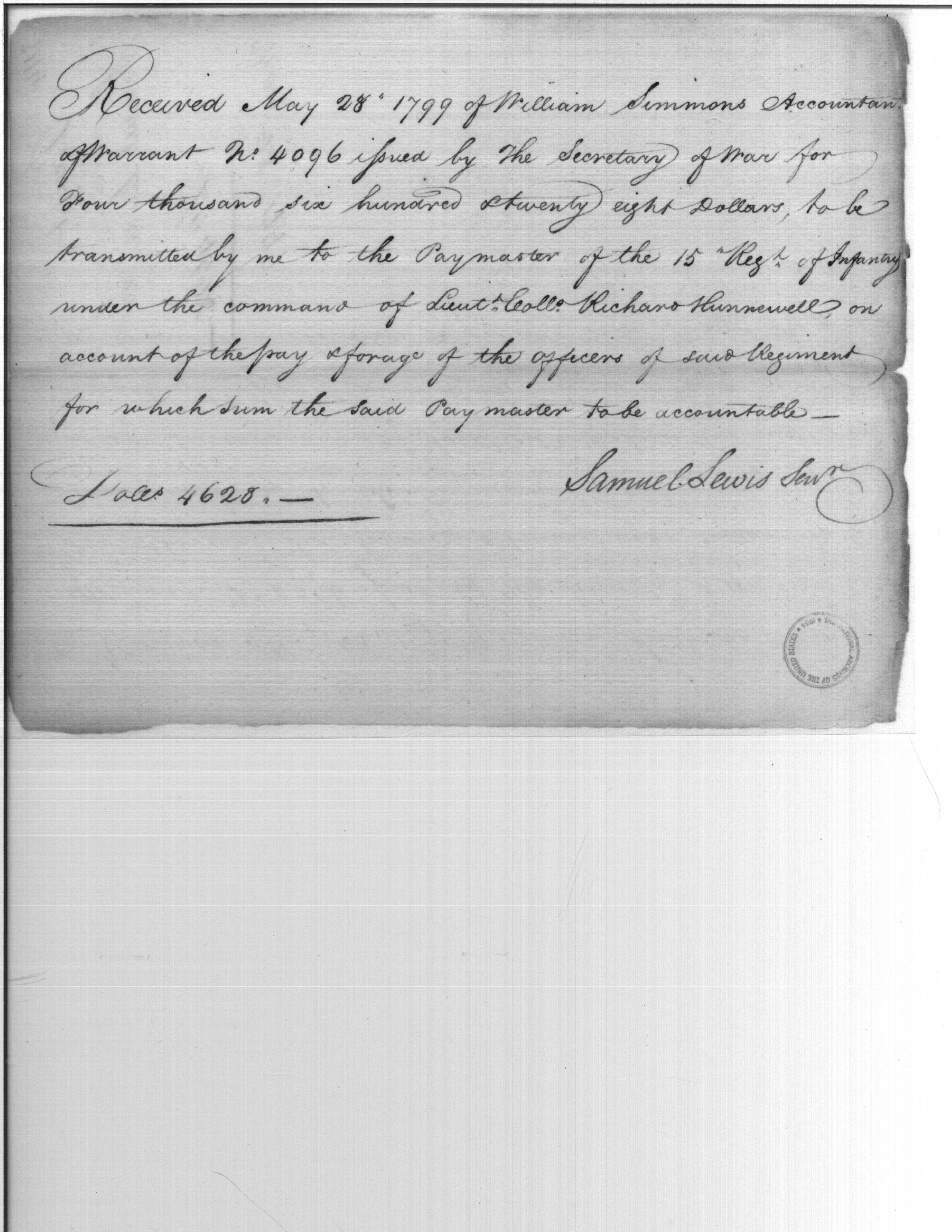 - Document: Receipt of William Simmons to Samuel Lewis to be transmitted to paymaster of 15th Regiment of Infantry