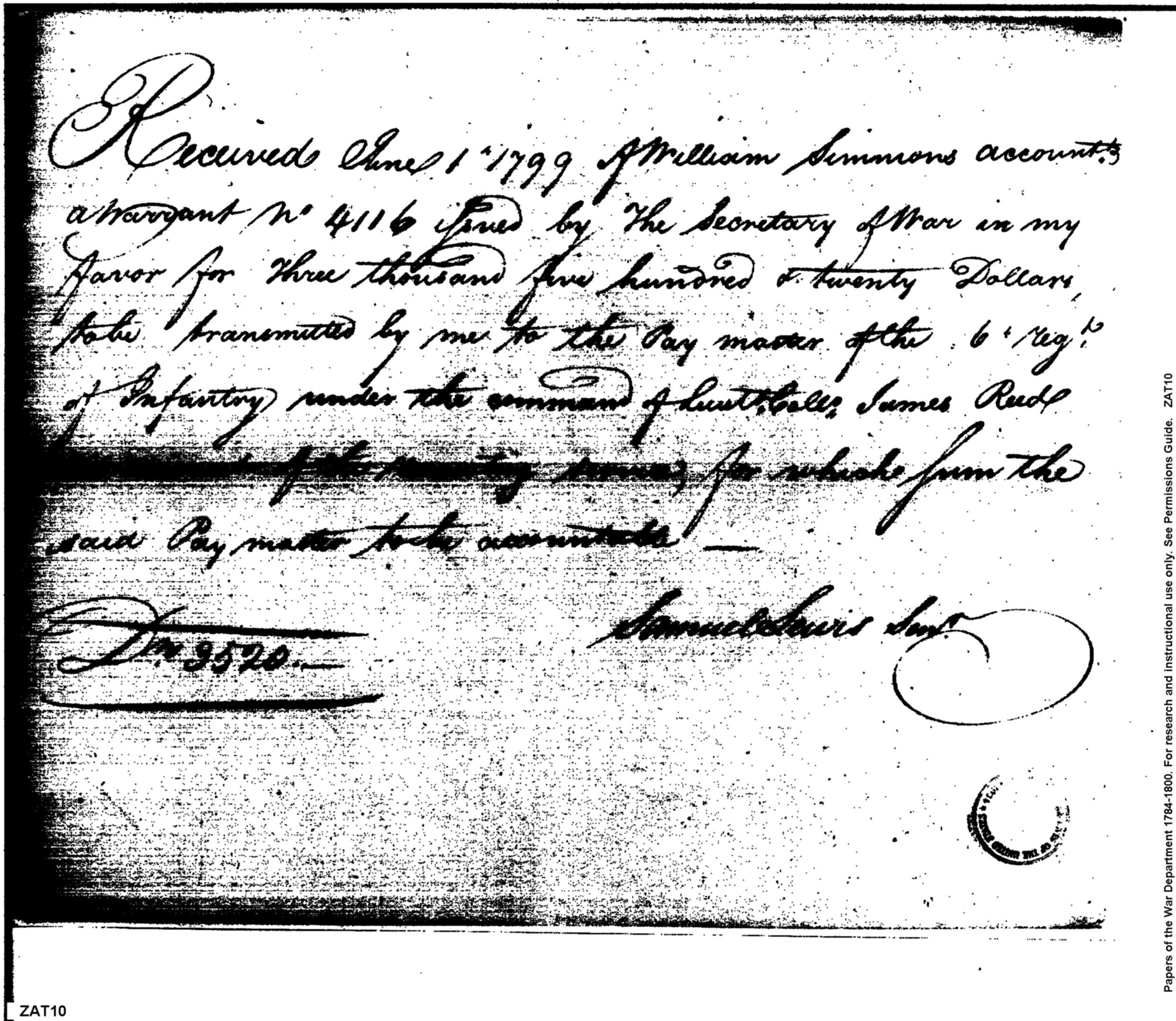 - Document: Receipt of Money to be Transmitted to Paymaster 6th Regiment of Infantry for Recruiting