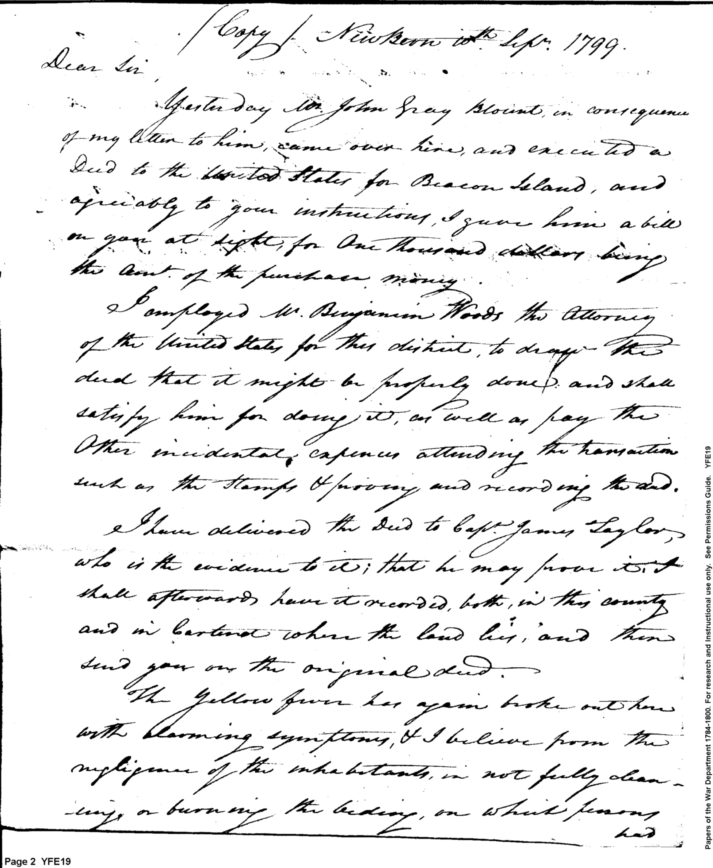 - Document: Deed for Beacon Island to John Gray Blount, Drawn by US Attorney W. Benjamin Woods, Delivered to Captain James Taylor
