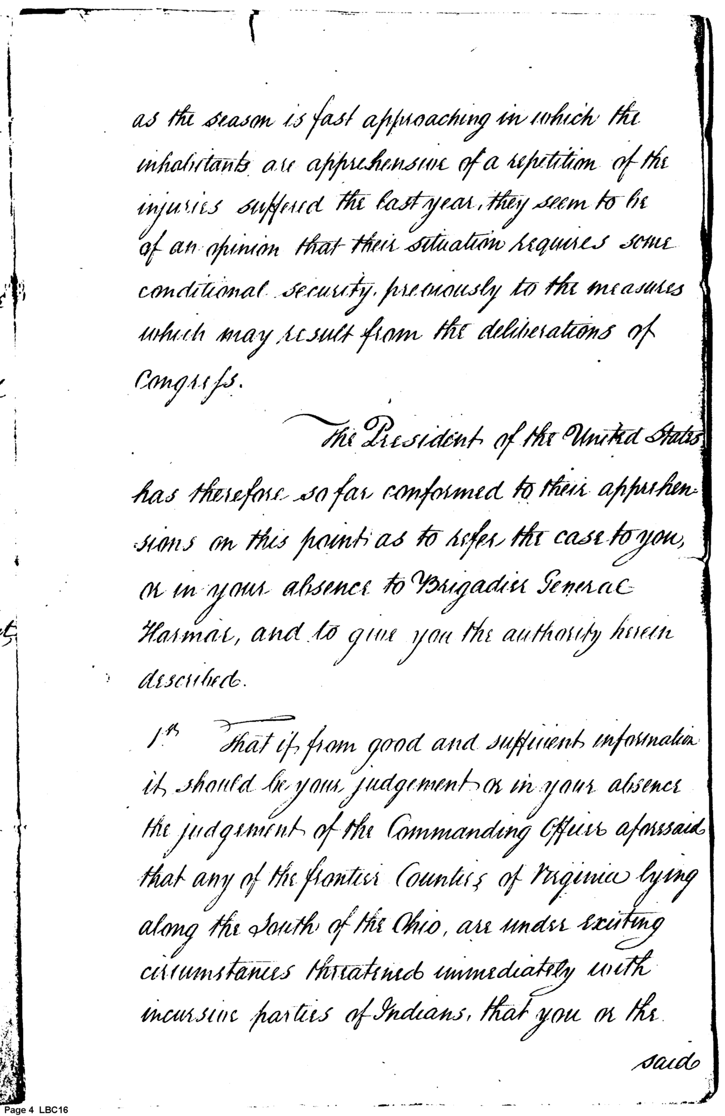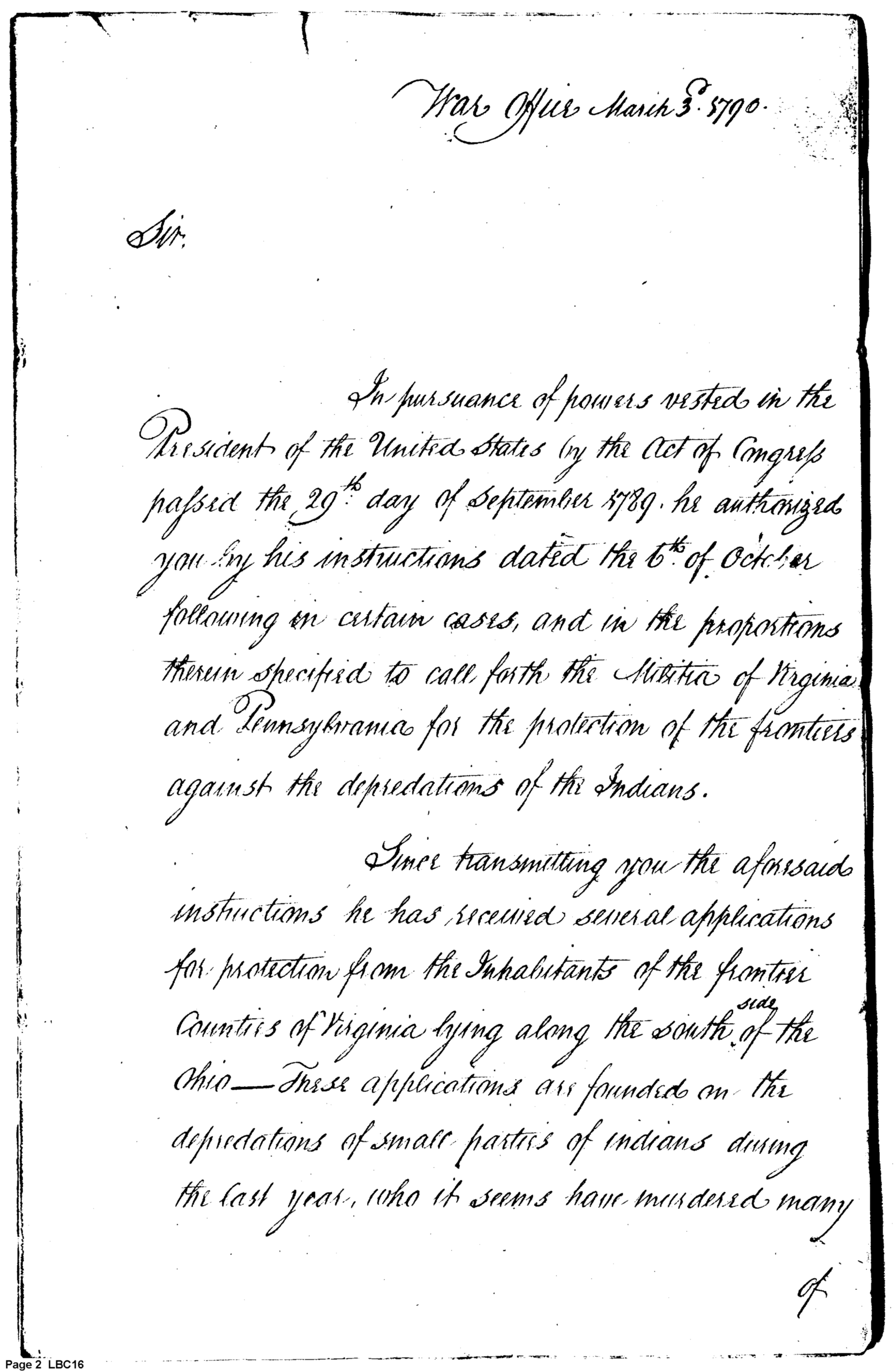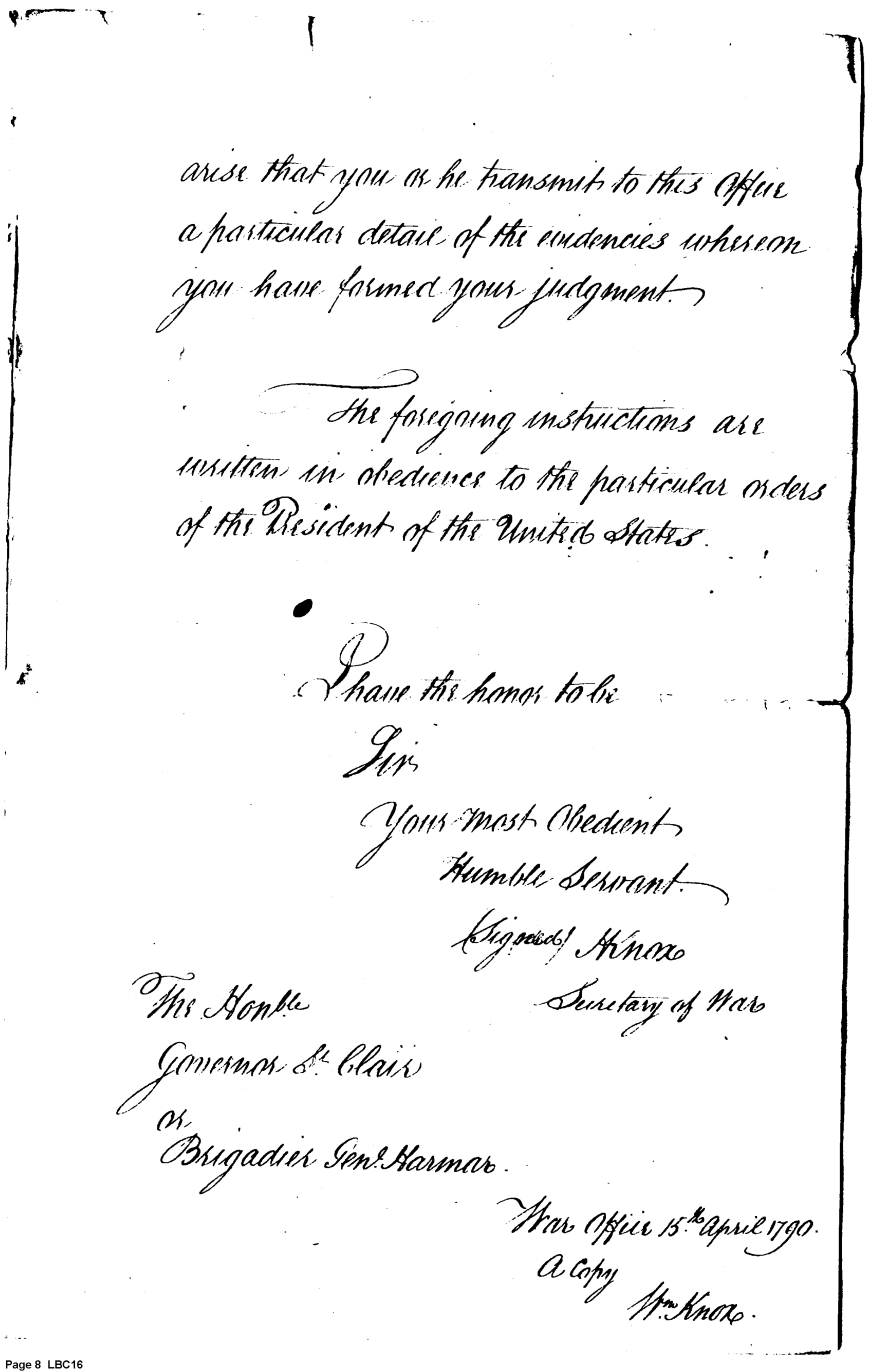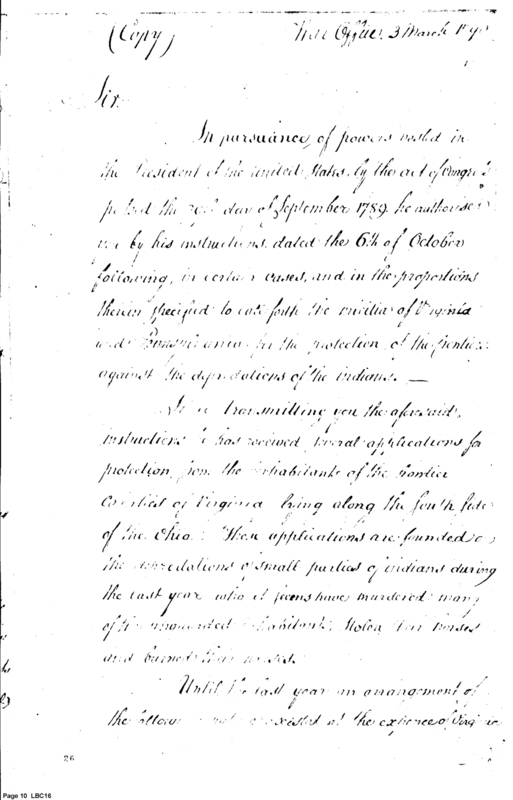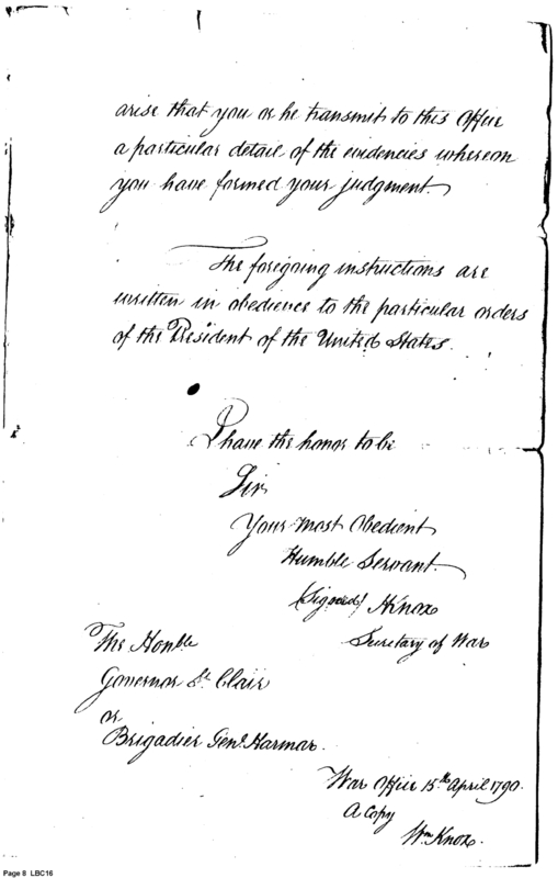 - Document: Copy of Instructions to the Governor of the Western Territory, or in his absence the Brigadier Gen. Harmar Copied 15th April (dated 3 March 3) 1790