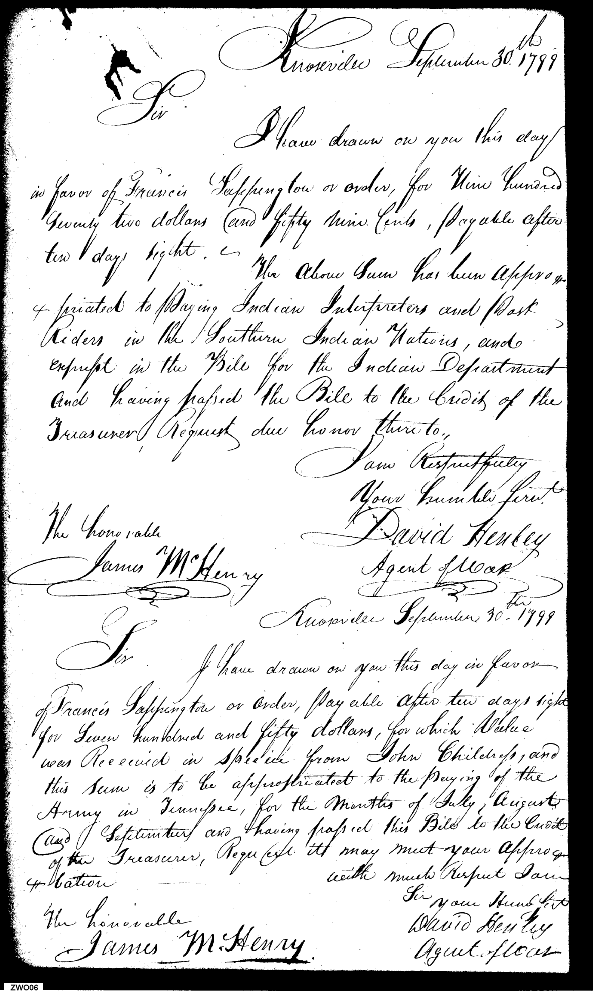 - In source: Collection: Letters Sent by David Henley, Agent of the War Department, May 1, 1799-May 7, 1800. (RG217)